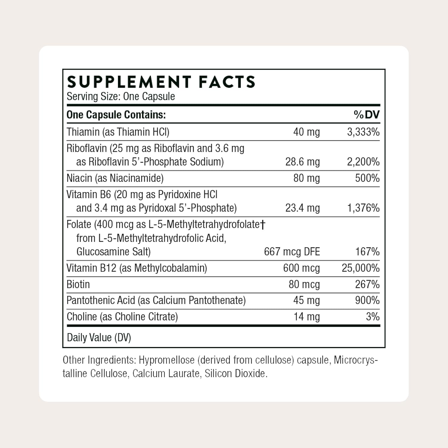 Una cápsula contiene: tiamina (como tiamina HCl) 40 mg, Riboflavina (25 mg como Riboflavina y 3,6 mg, Riboflavina 5'-Fosfato Sodio) 28,6 mg, Niacina (como Niacinamida) 80 mg, Vitamina B6 (20 mg como Pirida). oxina HCl y 3,4 mg como piridoxal 5'-fosfato) 23,4 mg, folato (400 mcg como L-5-metiltetrahidrofolato de ácido L-5-metiltetrahidrofólico, sal de glucosamina) 668 mcg DFE, vitamina B12 (como metilcobalamina) 600 mcg, Biotina 80 mcg, ácido pantoténico (como pantotenato de calcio) 45 mg, colina (como citrato de colina) 14 mg. Otros ingredientes: cápsula de hipromelosa (derivada de celulosa), celulosa microcristalina, laurato de calcio, dióxido de silicio.