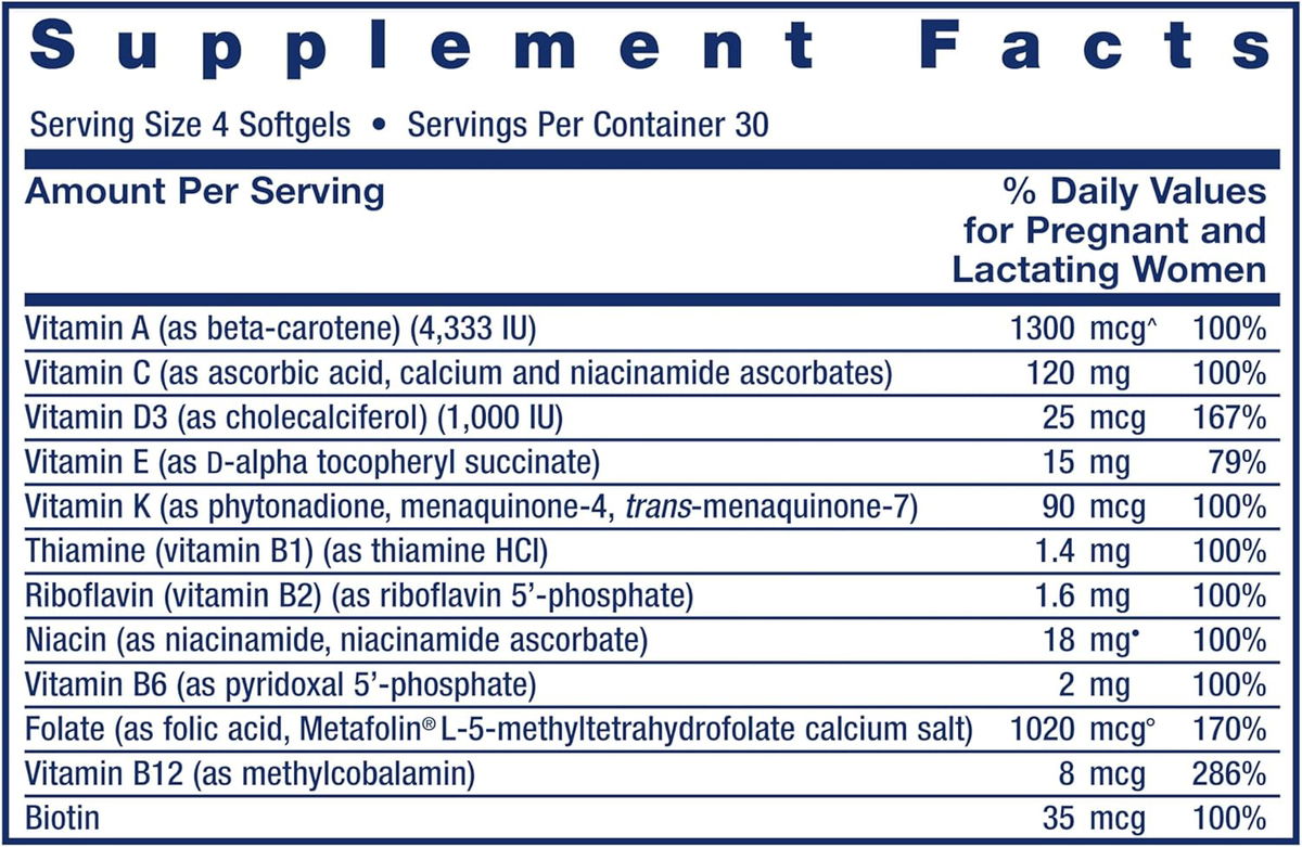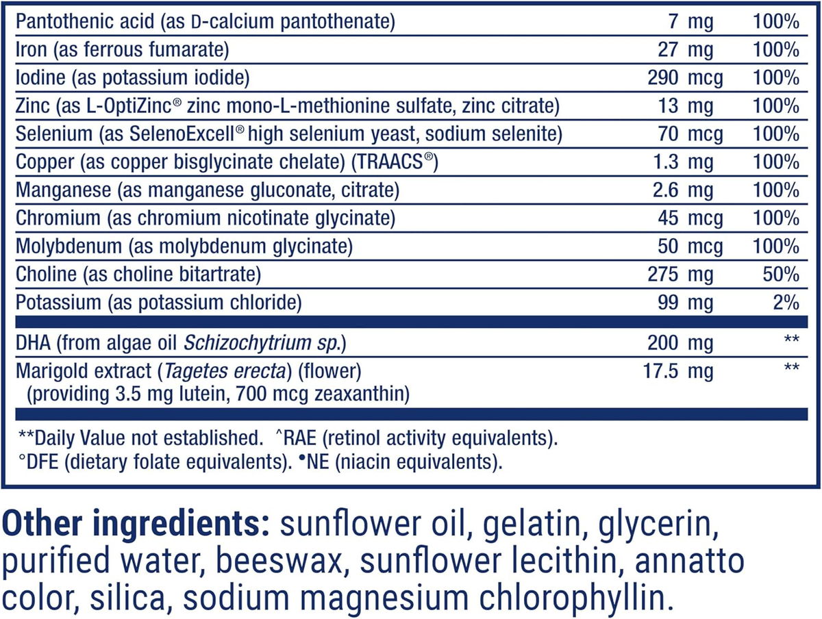 Las mujeres que están embarazadas, tratando de quedar embarazadas o que están amamantando tienen necesidades nutricionales únicas. Este suplemento basado en la ciencia proporciona las últimas dosis recomendadas de vitaminas y minerales, además de nutrientes como DHA omega-3, colina, luteína y zeaxantina tanto para mamá como para bebé.
