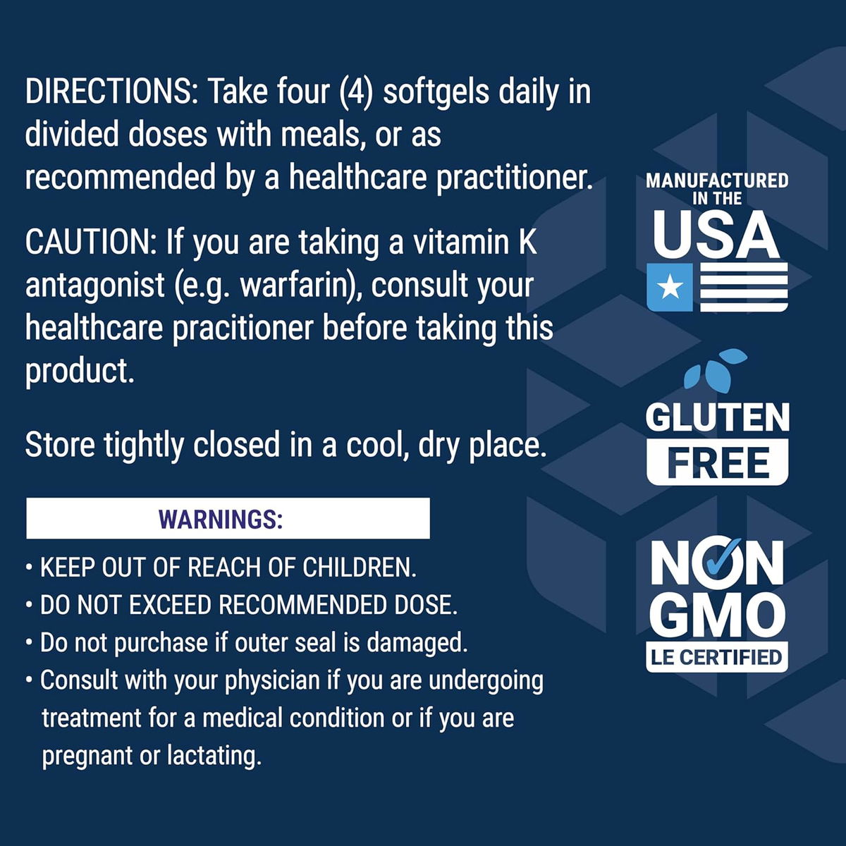 Tome cuatro (4) cápsulas blandas al día en dosis divididas con las comidas, o según lo recomendado por un profesional de la salud.*