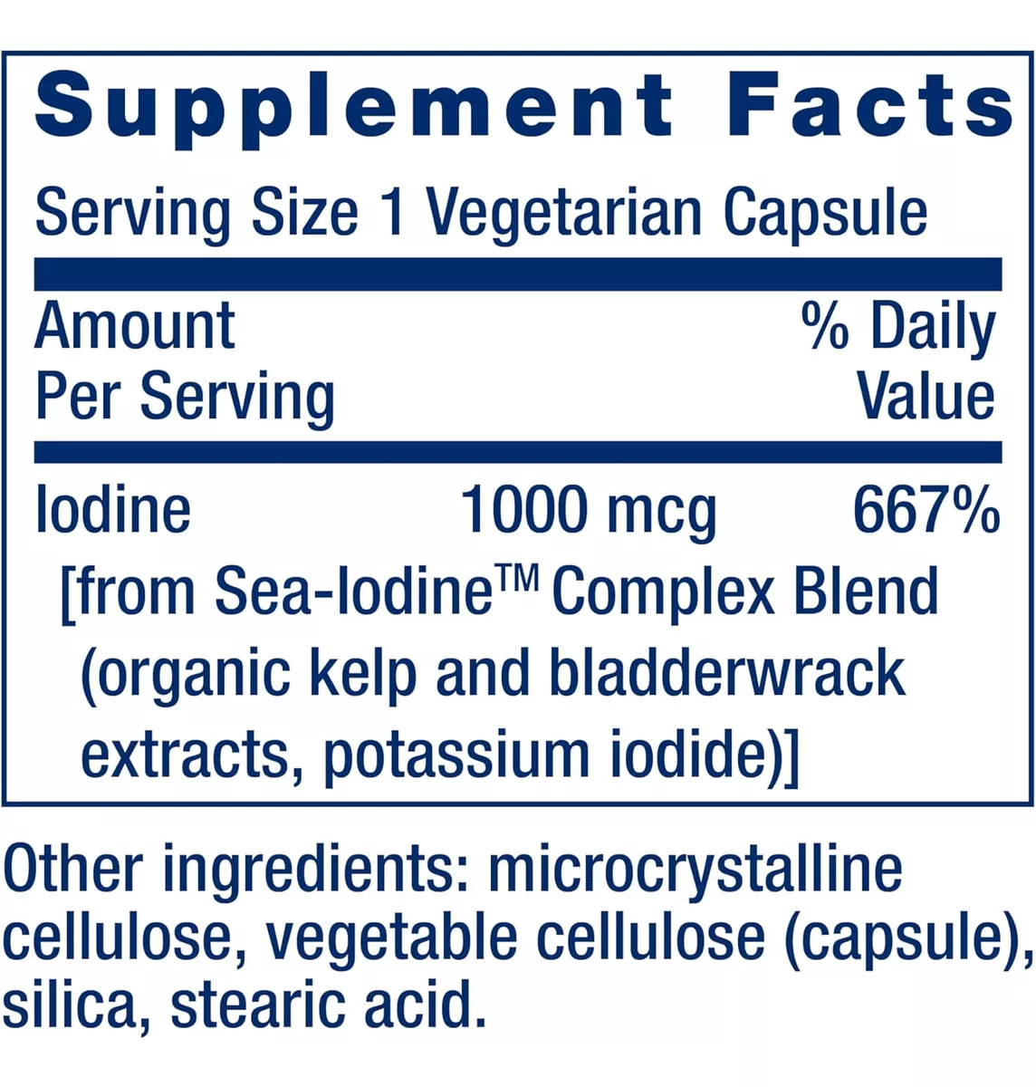 Yodo [de Sea-Yodine™ Complex Blend (extractos de algas orgánicas y vesiculares, yoduro de potasio) ] 1000 mcg, celulosa microcristalina, celulosa vegetal (cápsula), sílice, ácido esteárico.