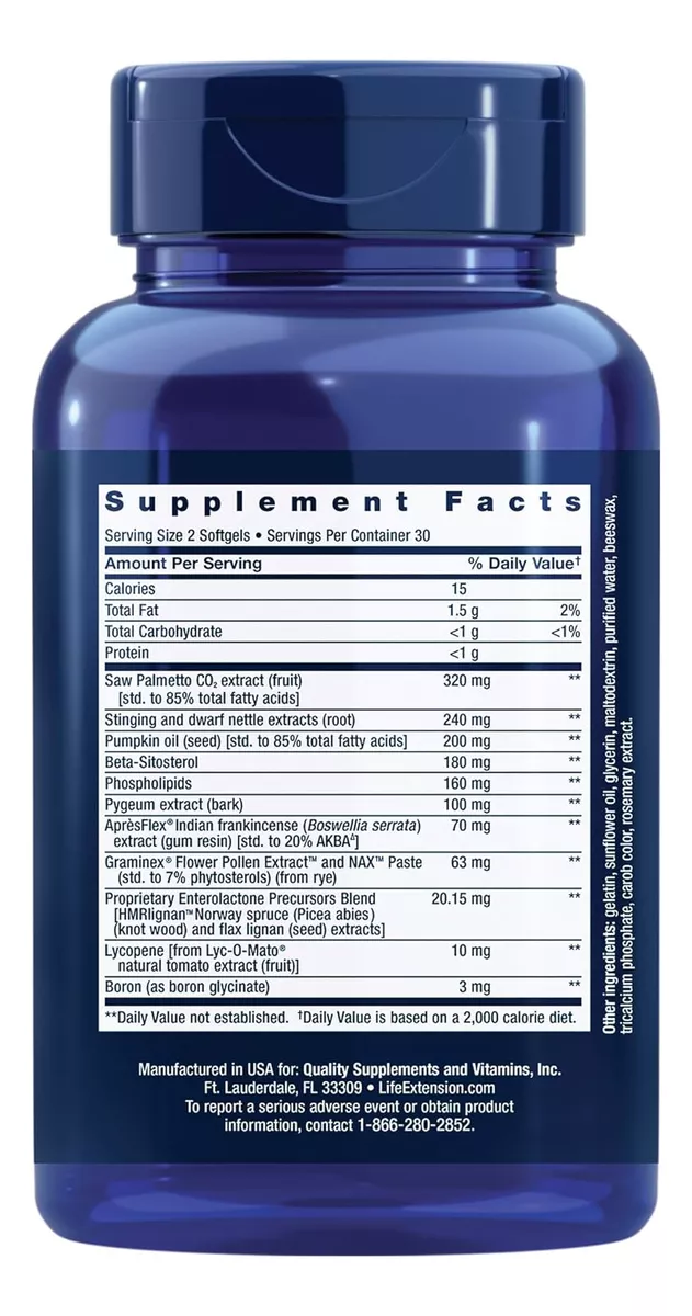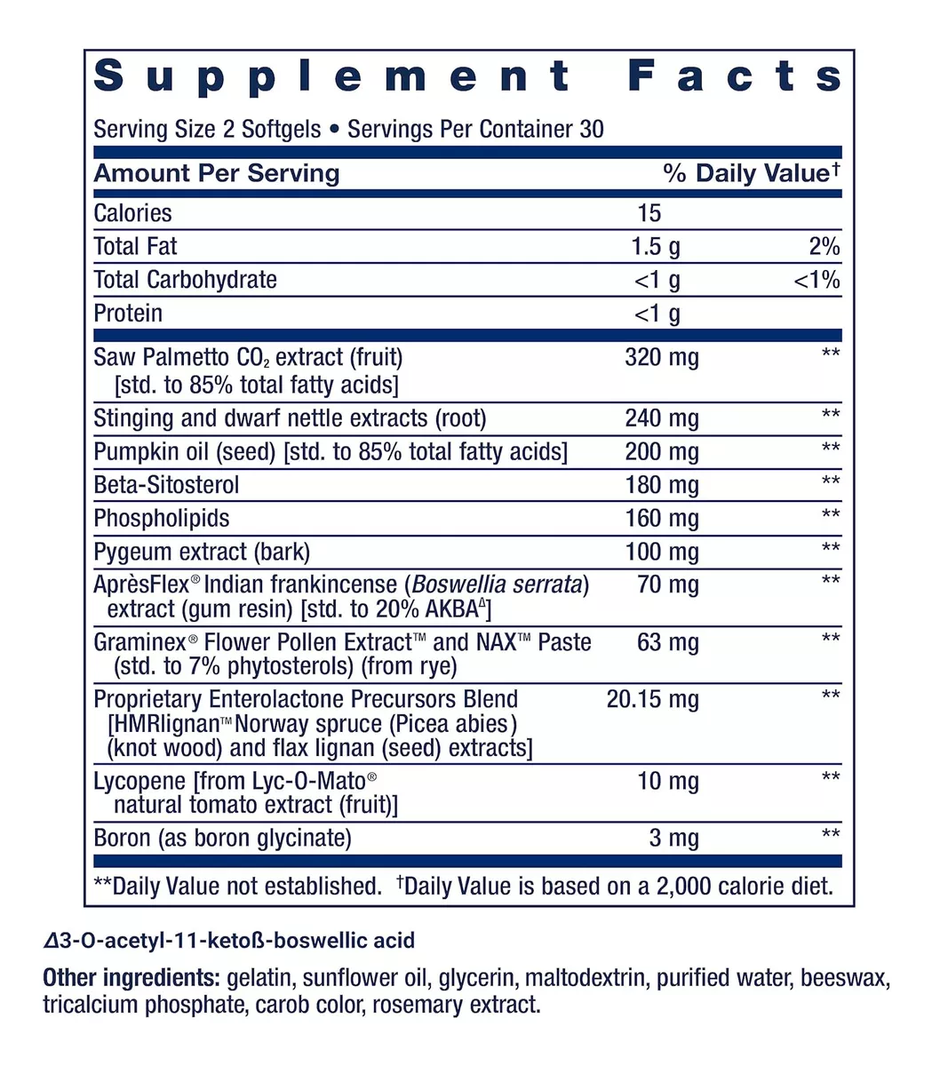 Extracto de CO2 de Saw Palmetto (fruta), Extractos de ortiga enana y escozor (raíz), Aceite de calabaza (semilla), beta-sitosterol, Fosfolípidos, Extracto de Pygeum (corteza), incienso indio AprèsFlex® (Boswellia serrata) extracto (resina de goma), Graminex® Flower Polen Extract™ y pasta NAX™ ( fitoesteroles) (de centeno) Mezcla patentada de precursores de enterolactona: HMRlignan™ Noruega abeto (Picea abies) (madera) y extractos de lignano de lino (semillas), licopeno: de extracto de tomate natural Lyc-O-Mato® (fruta) boro (fruta) como Albion® glicina bororgánica) 3 mg Otros ingredientes: gelatina, aceite de girasol, glicerina, maltodextrina, fosfato tricálcico, agua purificada, cera de abejas, color algarroba, extracto de romero.