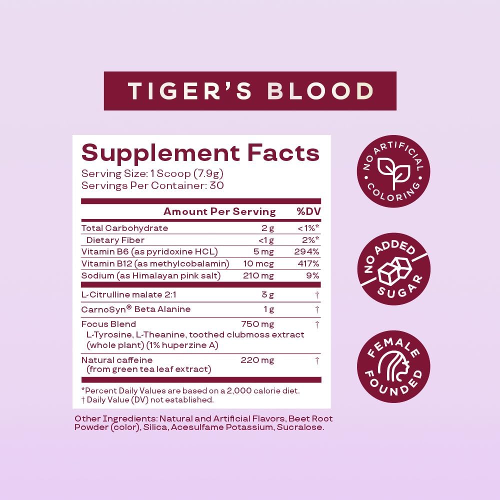 Malato de L-citrulina, beta alanina, L-tirosina, L-teanina, extracto de musgo dentado, cafeína natural (de extracto de hoja de té verde), sodio (de sal rosa del Himalaya), vitamina B6 (como piridoxina HCl), vitamina B12 (como metilcobalamina), sabores naturales y artificiales, polvo de raíz de remolacha (color), sílice, acesulfamo potásico um, y sucral talla única.