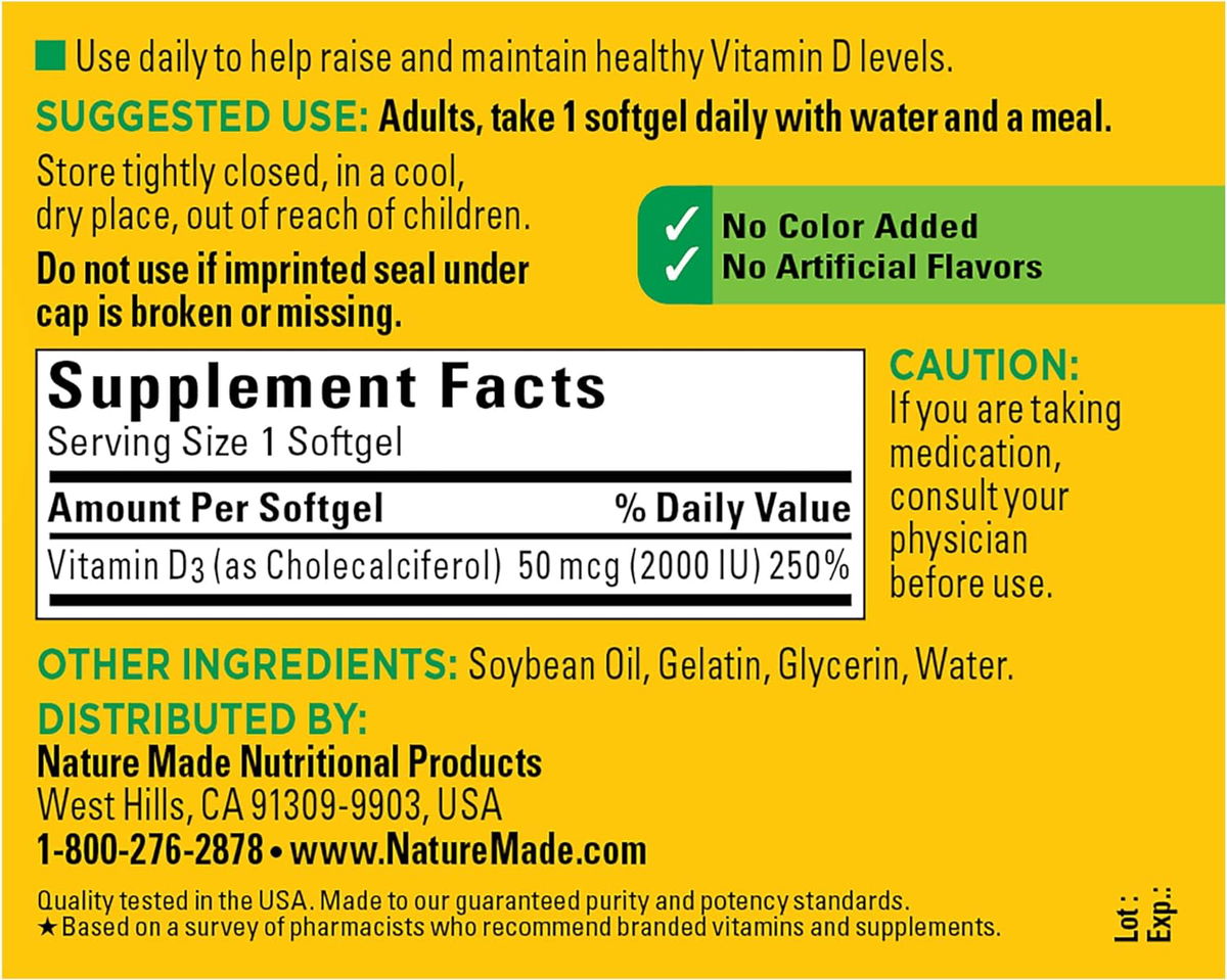 Procedente de ingredientes de alta calidad, este suplemento de vitamina D3 de Nature Made no contiene gluten y no tiene color añadido ni sabores artificiales. Marca recomendada por farmacéuticos de vitaminas y suplementos