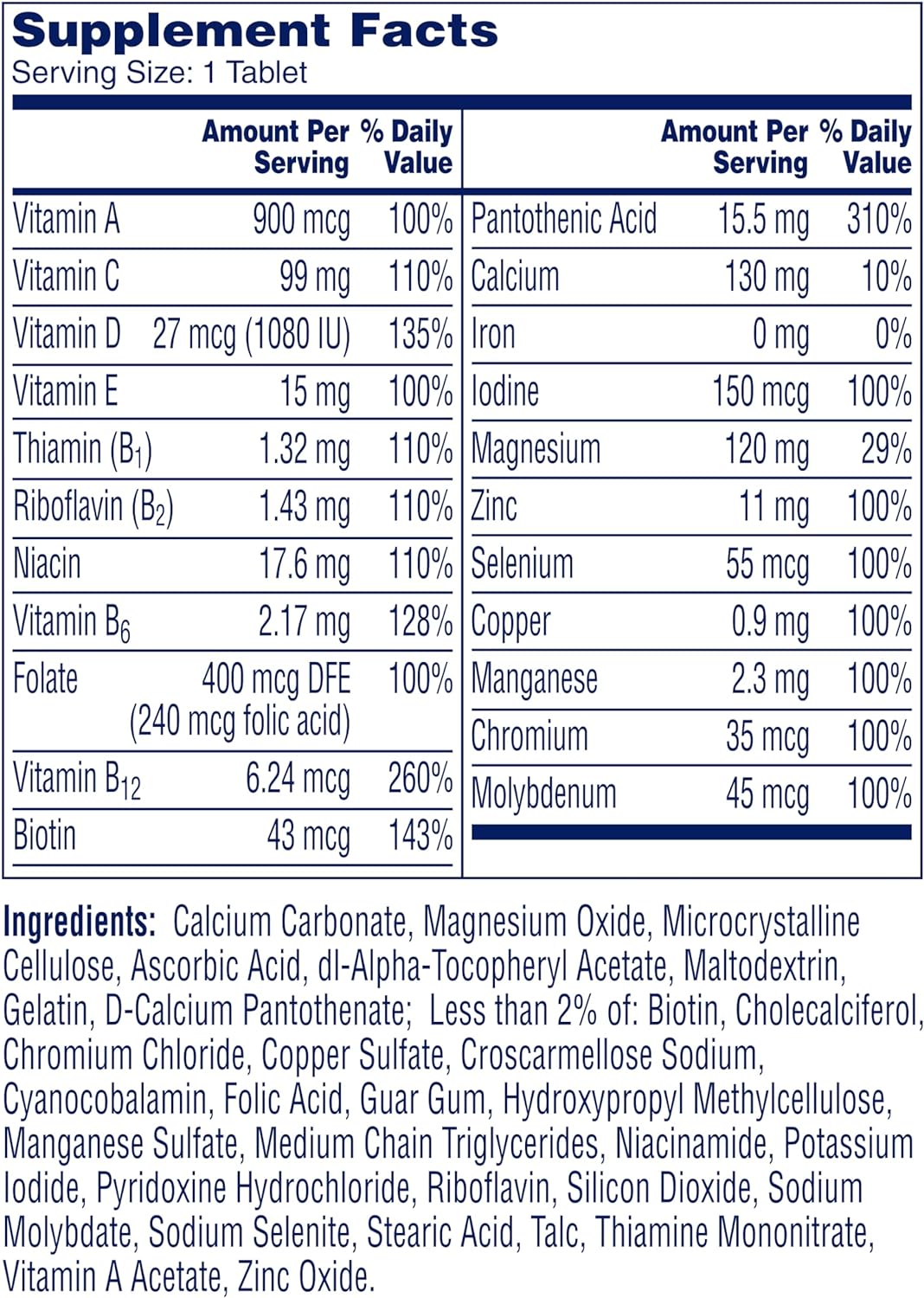 Vitamina A, vitamina C, vitamina D, vitamina E, tiamina (B1), riboflavina (B2), niacina, vitamina B6, folato, vitamina B12, biotina, ácido pantoténico, calcio, hierro, yodo, magnesio, Zinc, selenio, cobre, manganeso, cromo, licopeno, celulosa microcristalina, maltodextrina, croscarmelosa sódica, gelatina, hidroxipropilmetilcelulosa, inulina, triglicéridos de cadena media, dióxido de silicio, ácido esteárico.