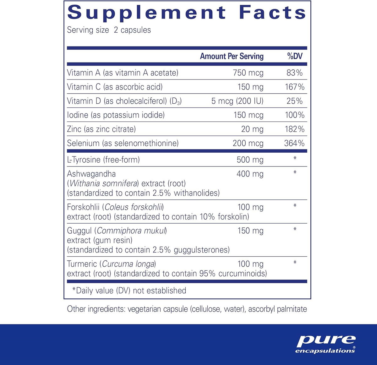 Cada tamaño de porción (2 cápsulas) contiene: vitamina A 750 mcg, vitamina C 150 mg, vitamina D (D3) 5 mcg, yodo 150 mcg, zinc 20 mg, selenio 200 mcg, L-tirosina 500 mg, extracto de raíz Ashwagandha 400 mg, extracto de raíz Forskohlii 328.1 ft g, extracto de resina de goma Guggul 150 mg, extracto de raíz de cúrcuma 100 mg. Otros ingredientes: cápsula vegetariana (celulosa, agua), palmitato de ascorbilo.