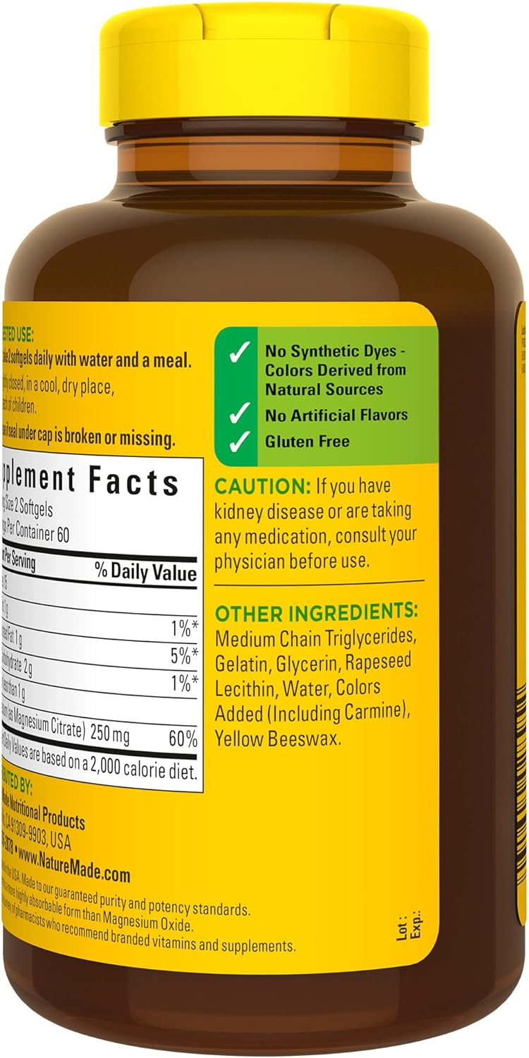 Suplemento muscular: una botella contiene 60 unidades de citrato de magnesio Nature Made en cápsulas blandas de 250 mg