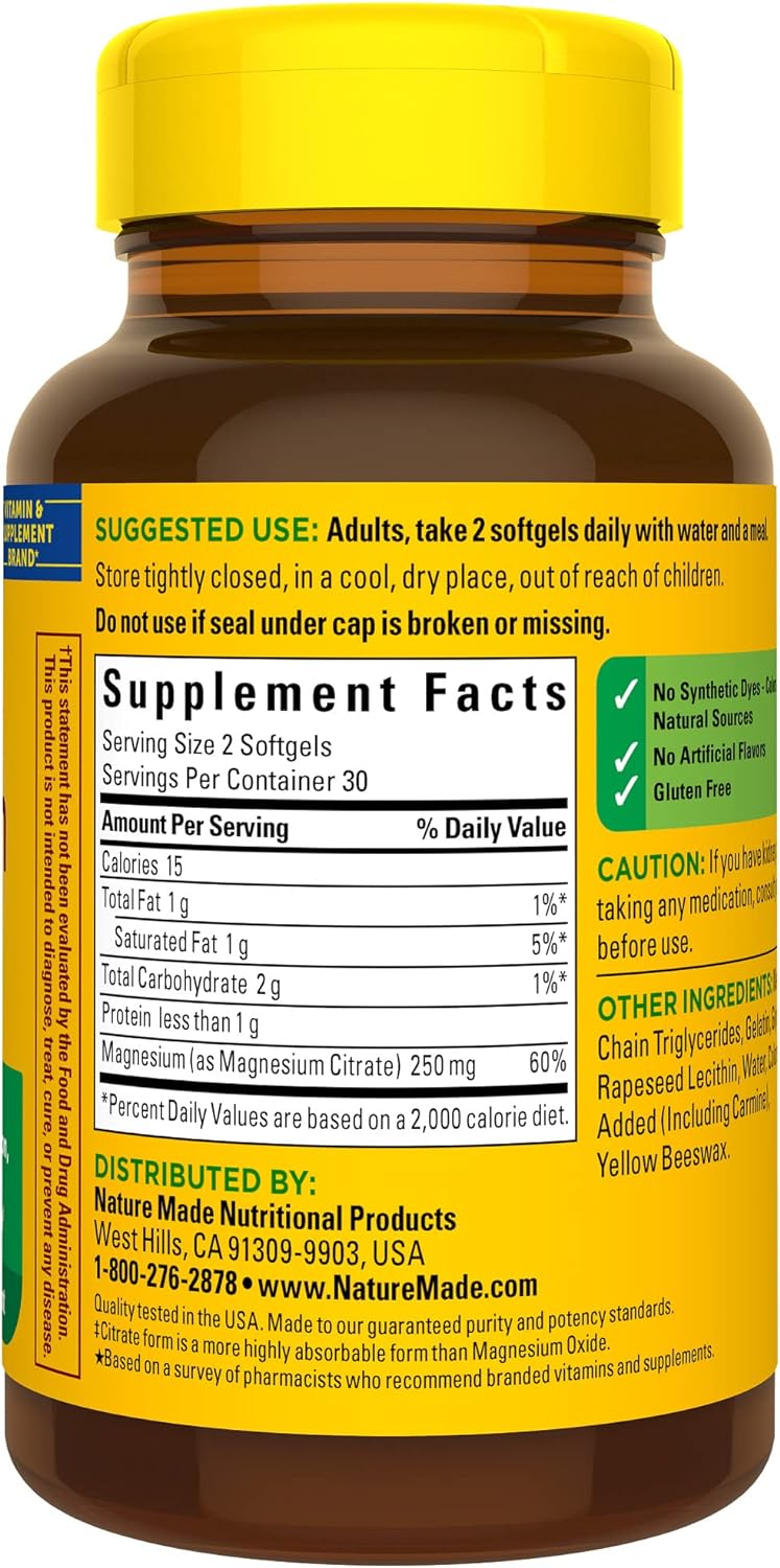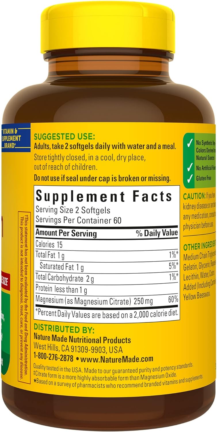 NATURE MADE - MAGNESIUM CITRATE 250MG Citrato de magnesio 250 mg por porción (250 mg por cápsulas blandas), cápsulas para el soporte nutricional