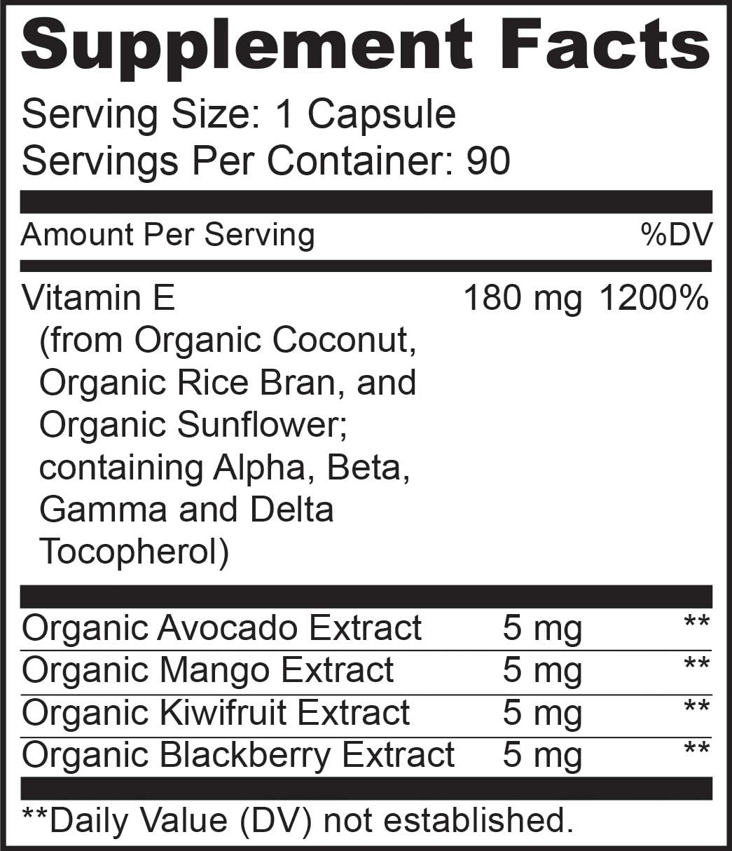 Vitamina E (de coco orgánico, salvado de arroz orgánico y girasol orgánico) 180 mg 1200%, extracto de aguacate orgánico 5 mg, extracto de mango orgánico 5 mg, extracto de kiwi orgánico (fruta) 5 mg, extracto de mora orgánica 5 mg, otros ingredientes: cápsula de celulosa vegetal