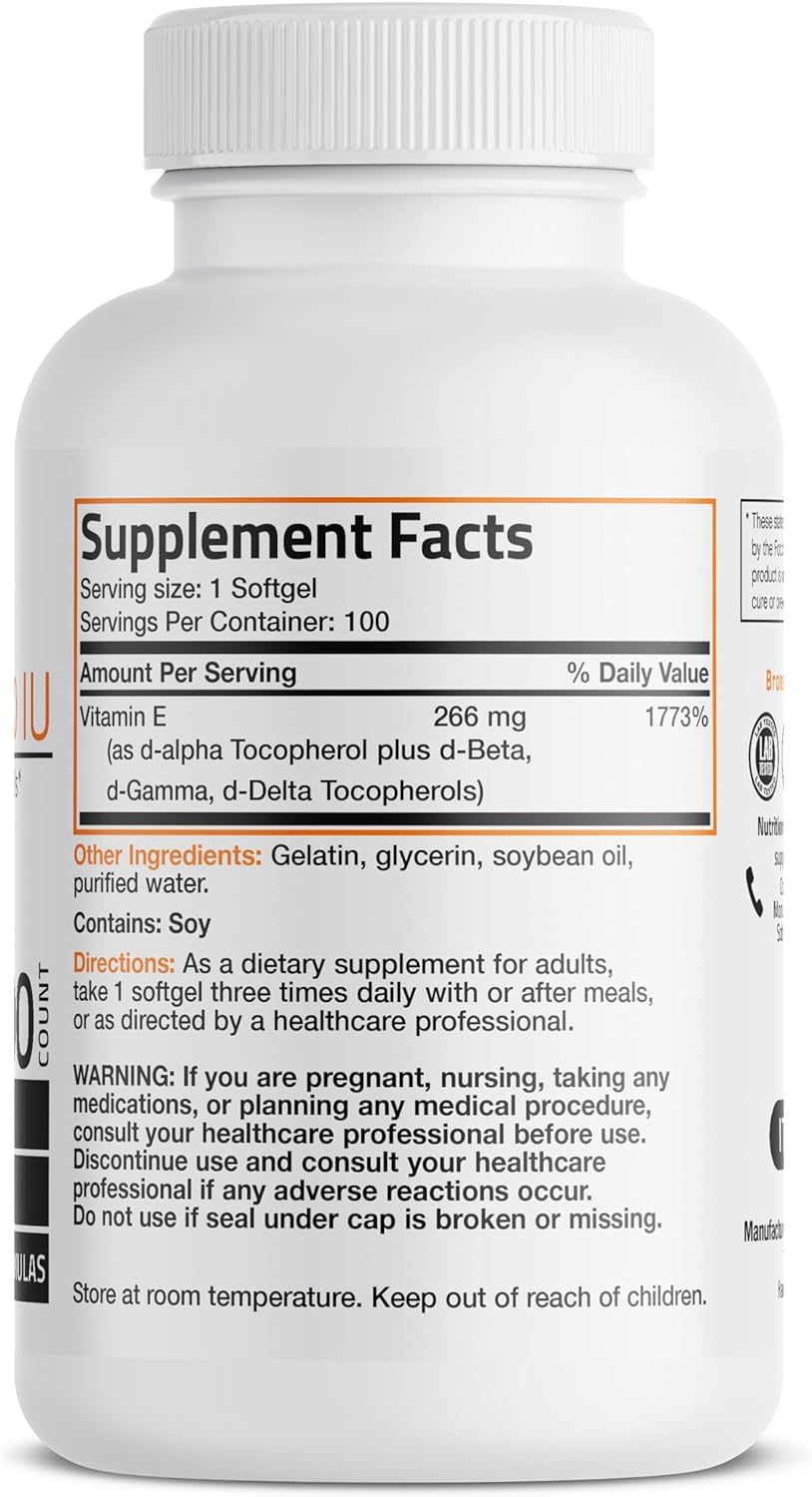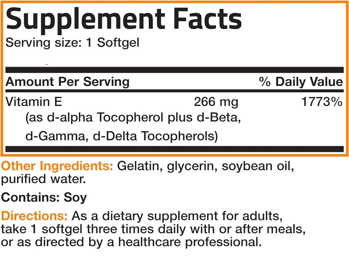 Cápsulas blandas naturales de vitamina E fáciles de tragar: contiene 400 UI de vitamina E natural por cápsula blanda diminuta de d-alfa tocoferol más d-beta, d-gamma y d-Delta tocoferoles. La vitamina E ayuda a apoyar la piel sana y la función inmunológica.