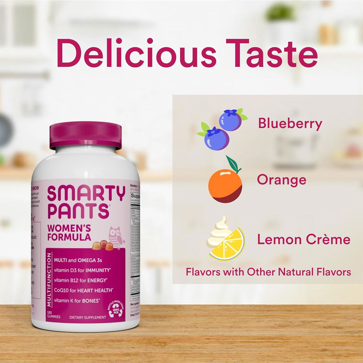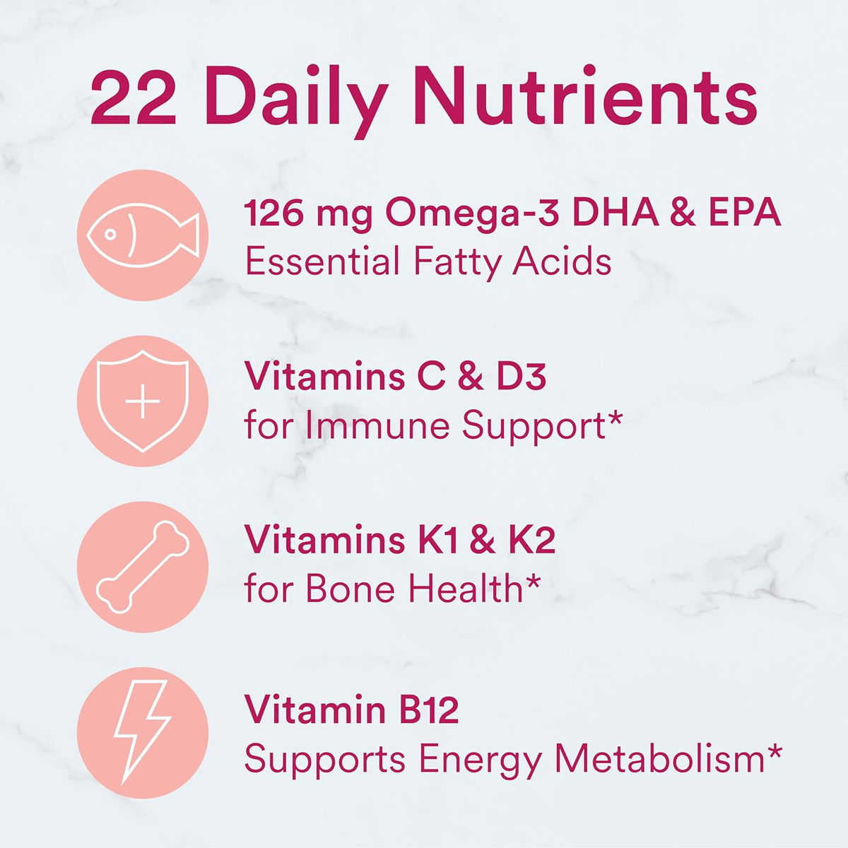 Utilizamos ingredientes extra premium y nutrientes esenciales cuidadosamente seleccionados para que las mujeres entregen ácidos grasos esenciales omega-3 (EPA y DHA) de aceite de pescado y apoyo para su inmune, energía, corazón, salud ósea y mucho más. Todo en una porción deliciosa extra.