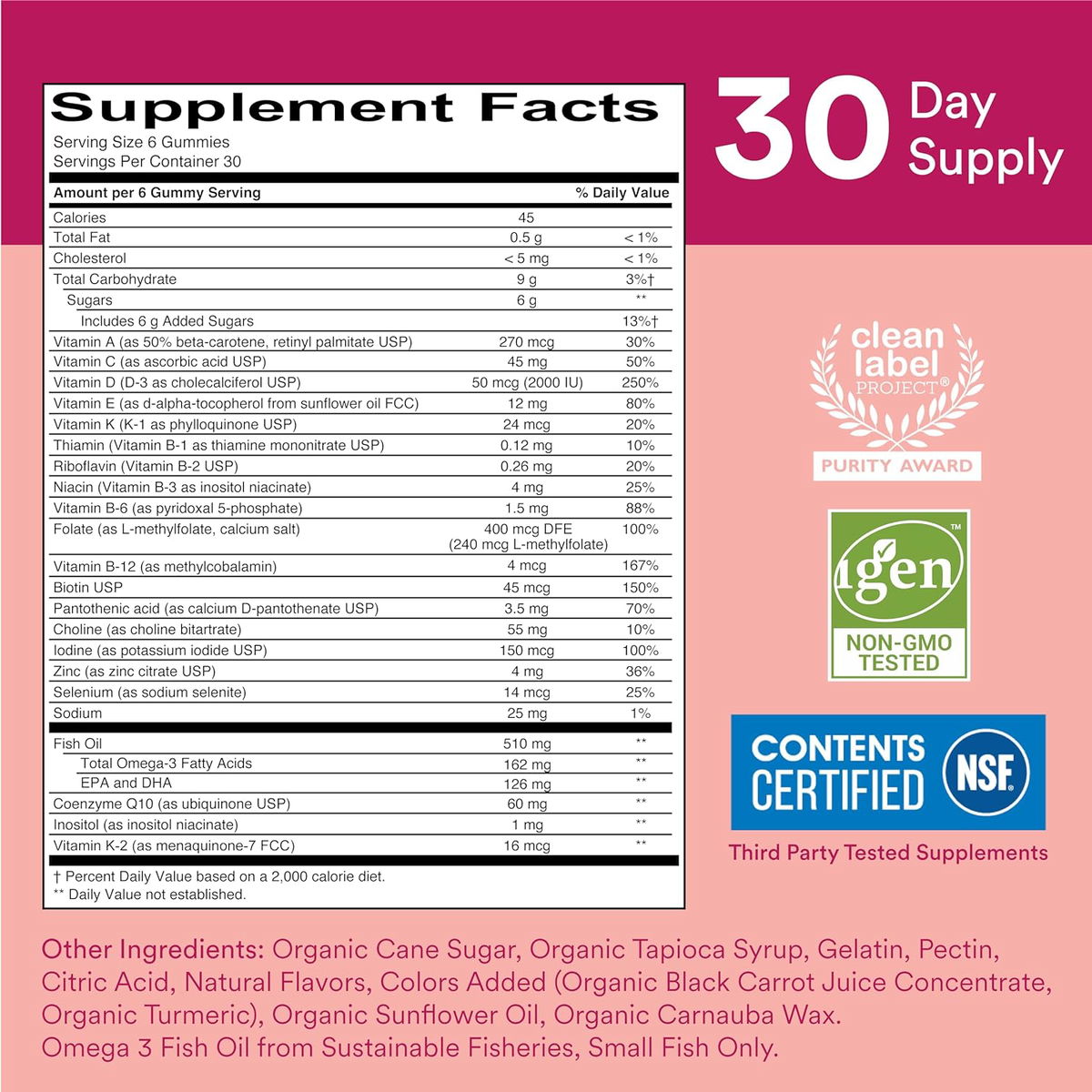 Vitamina A, Vitamina C, Vitamina D, Vitamina E, Vitamina K, Vitamina B1, Vitamina B2, VitaminaB3, Vitamina B6, Vitamina B12, Azúcar de caña orgánica, jarabe de tapioca orgánica, gelatina, pectina, ácido cítrico, sabores naturales, colorantes agregados (concentrado de jugo de zanahoria negra orgánica, cúrcuma orgánica), aceite de girasol orgánico, cera de carnauba orgánica.
