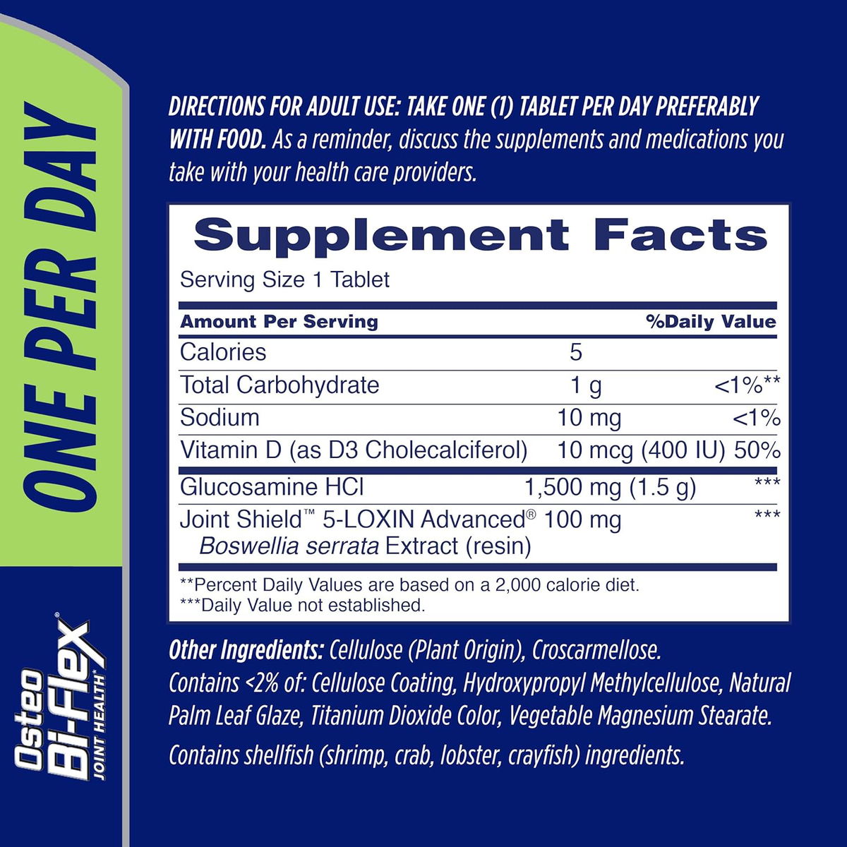 Glucosamina, Vitamina C, Sodio, Celulosa (de origen vegetal), hidroxipropilmetilcelulosa, croscarmelosa, revestimiento de celulosa. Contiene <2 % de: glaseado de hoja de palma natural, color de dióxido de titanio, estearato de magnesio vegetal. Contiene ingredientes de mariscos (cangrejo, cangrejo de río, langosta, camarones).