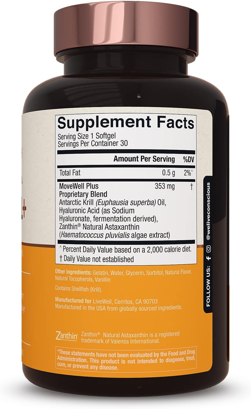 Live Conscious Suplemento para la salud articular - MoveWell Plus Aceite de krill antártico, astaxantina natural y ácido hialurónico | Supera a la glucosamina