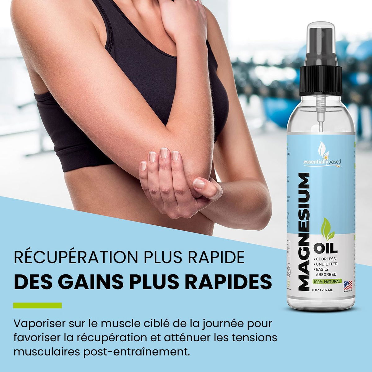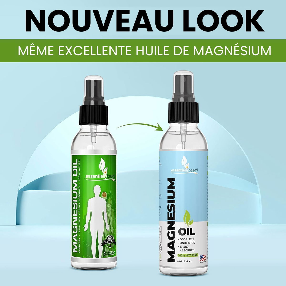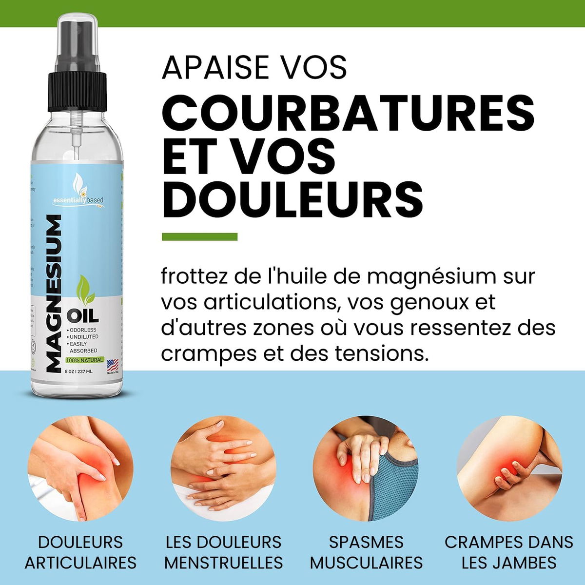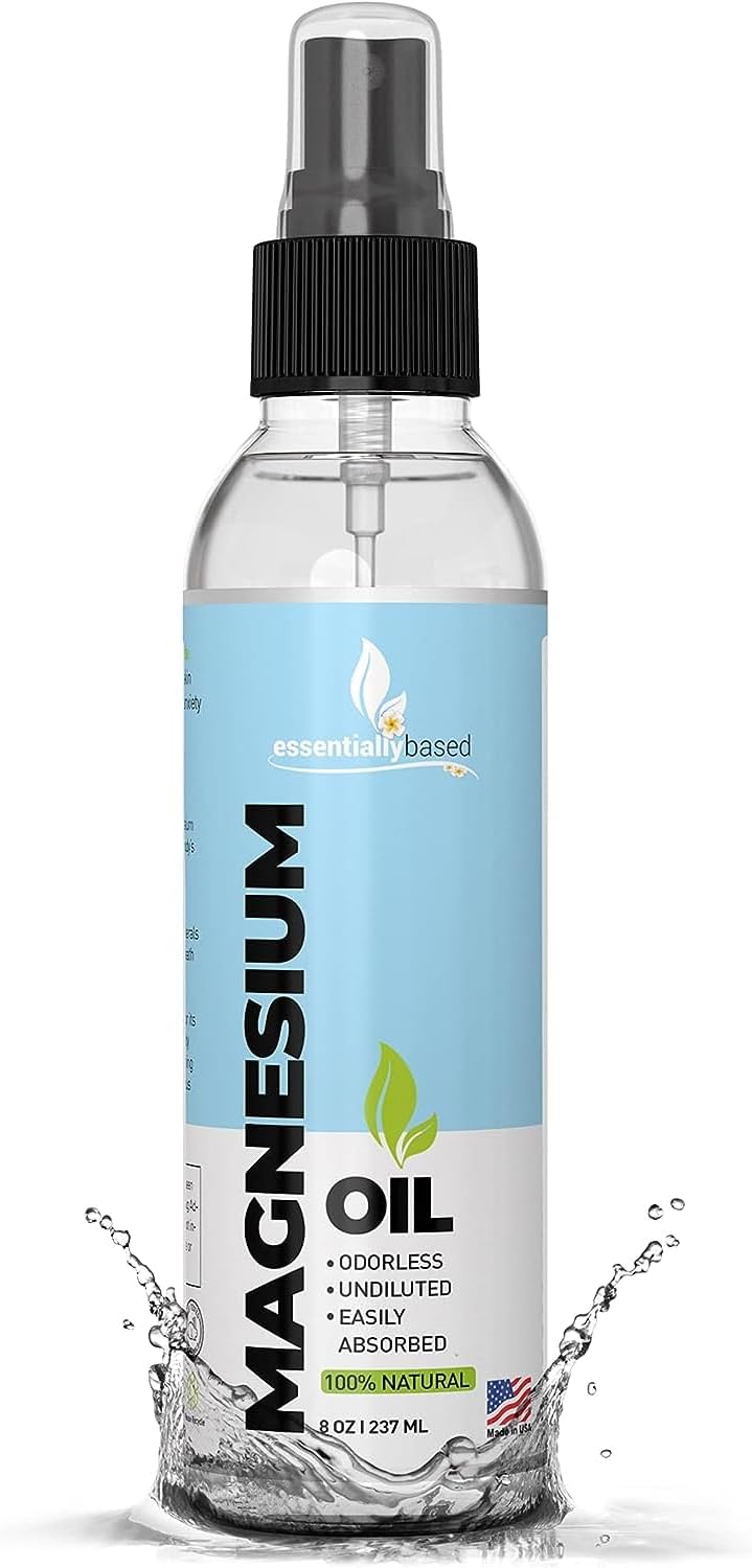ESSENTIALLYBASED - MAGNESIUM OIL Atomizador de aceite de magnesio 100 % puro, fuerza extra de 0.12 oz por onza, tamaño grande de 8 oz, alivia el dolor y ayuda a dormir de manera natural, fuente mineral esencial