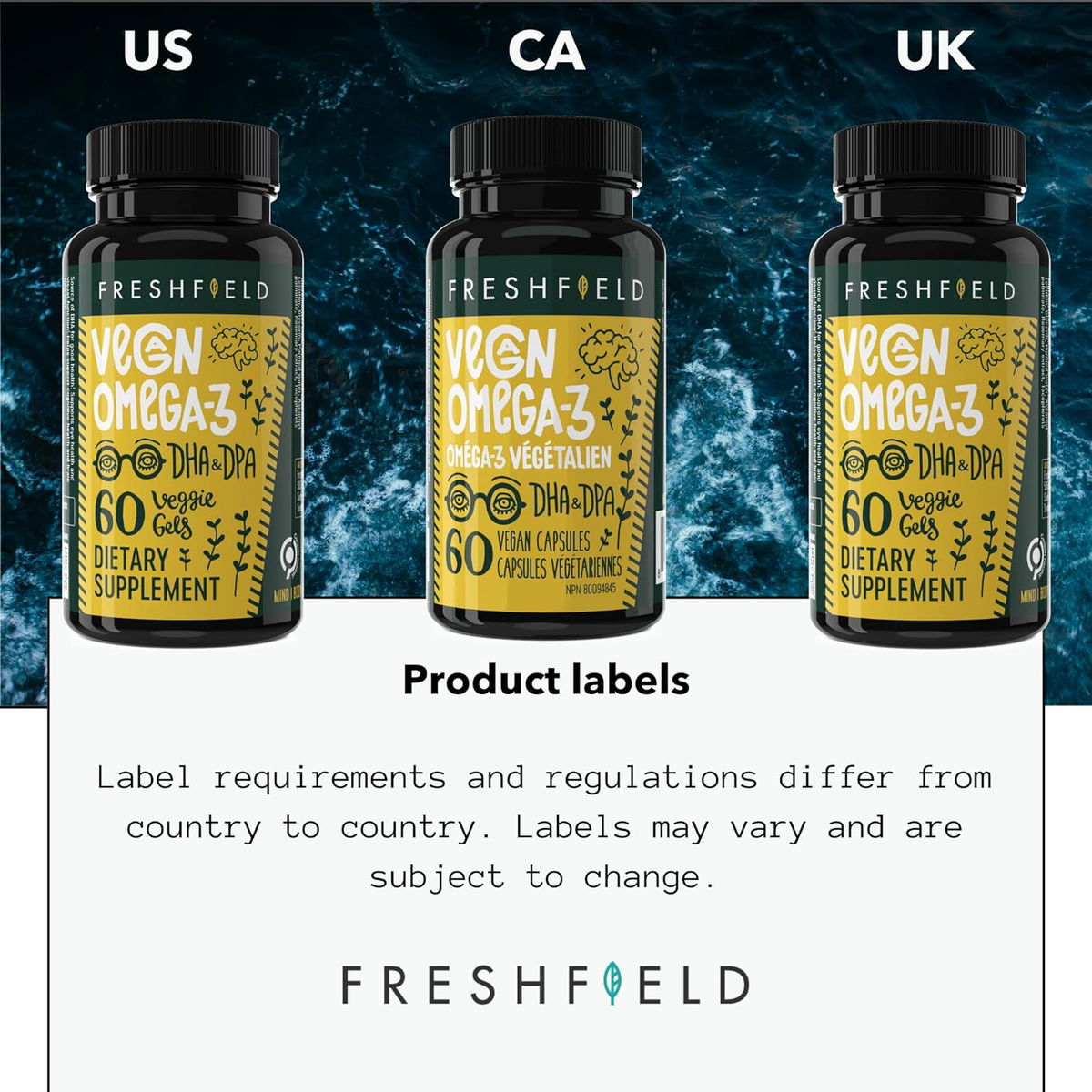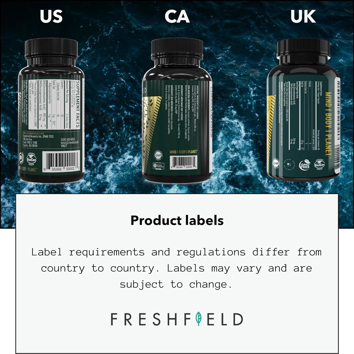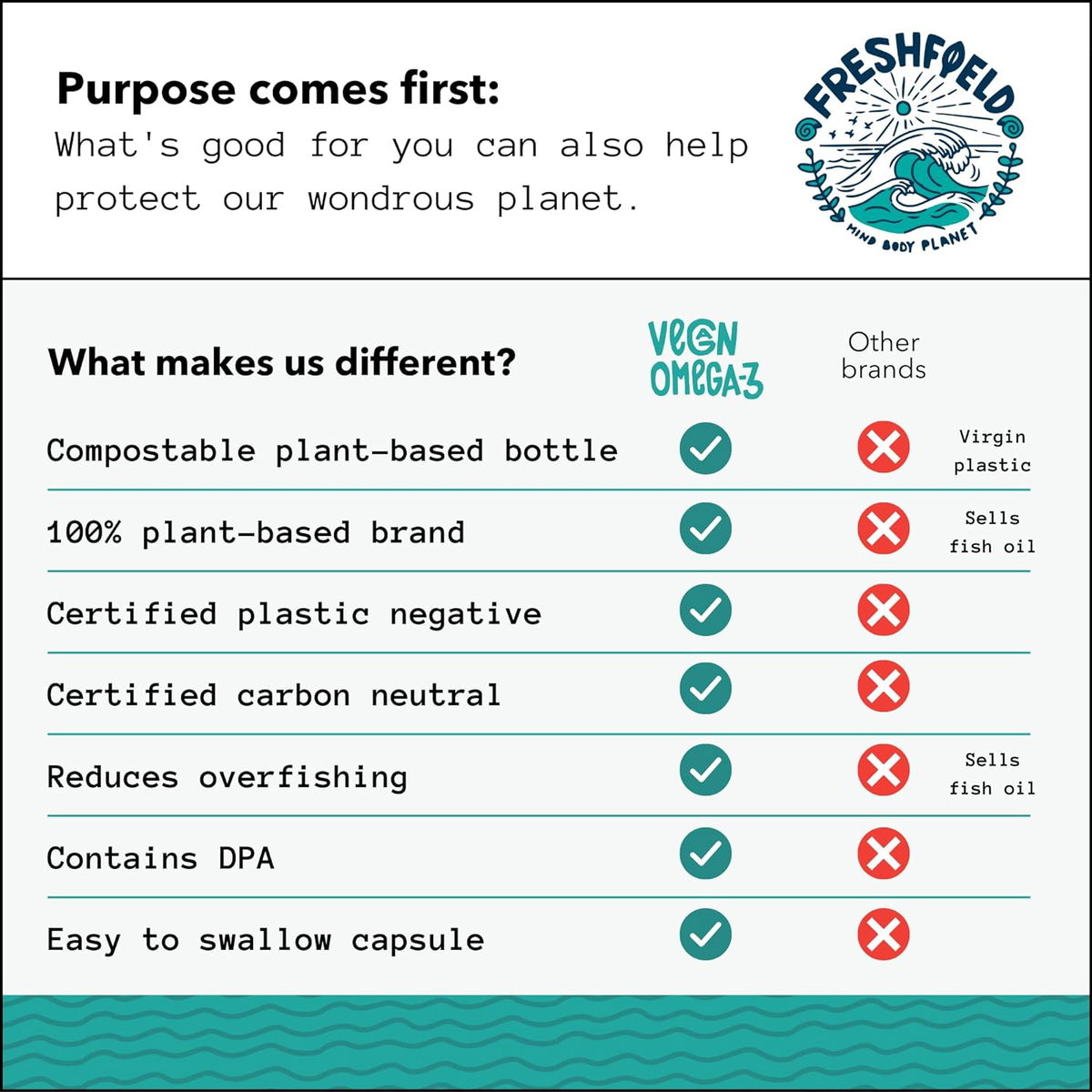 Freshfield Vegan Omega 3 DHA: de origen sostenible, premium, sin carragenano, botella compostable, reemplazo de aceite de pescado, neutro en carbono. Soporta corazón, cerebro, salud articular con DPA