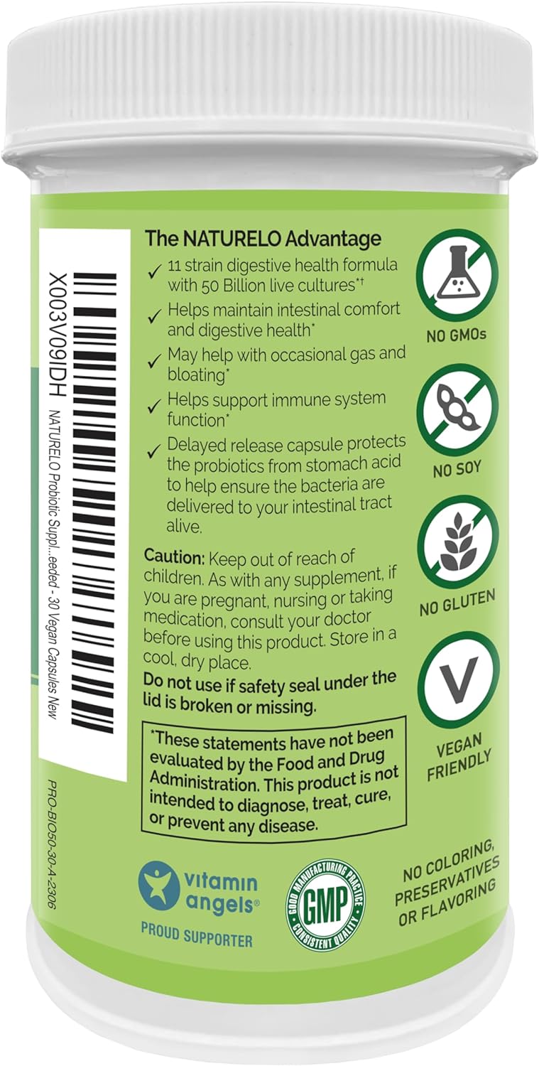 NATURELO Suplemento probiótico – 50 mil millones de UFC – 11 cepas – un día – Ayuda a apoyar la salud digestiva e inmune – Liberación retardada – No necesita refrigeración, cápsulas veganas.