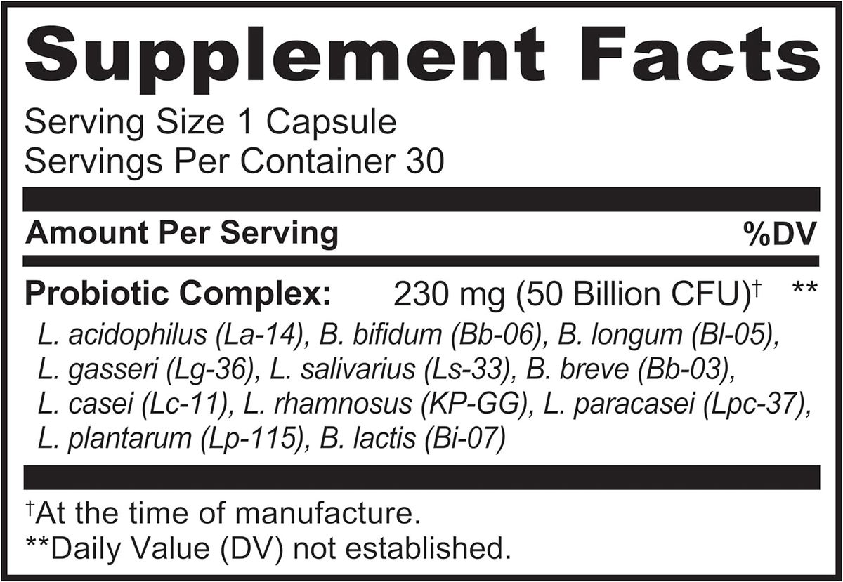 Complejo probiótico con 50 mil millones de UFC, incluyendo L. acidophilus, L. plantarum, L. rhamnosus, L. paracasei, L. salivarius, L. casei, L. gasseri, B. longum, B. lactis, B. breve, B. bifidum. Otros ingredientes: Cápsula de celulosa vegetal