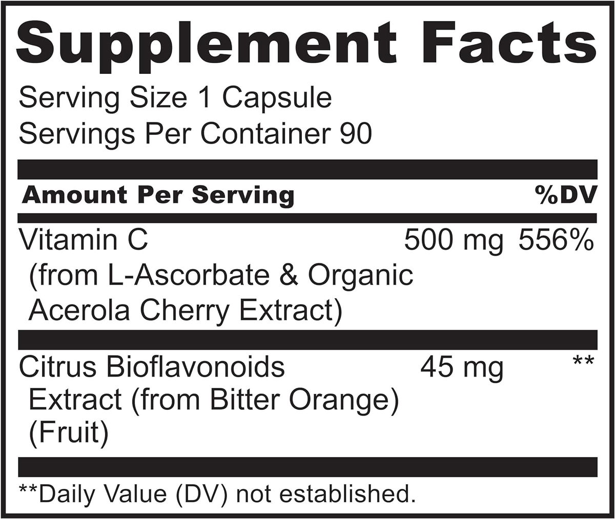 Vitamina C (de L-ascorbato y extracto de cereza de acerola orgánica) 500 mg 830%, bioflavonoide cítrico (de naranja orgánico y limón orgánico) 45 mg, otros ingredientes: cápsula de celulosa vegetal