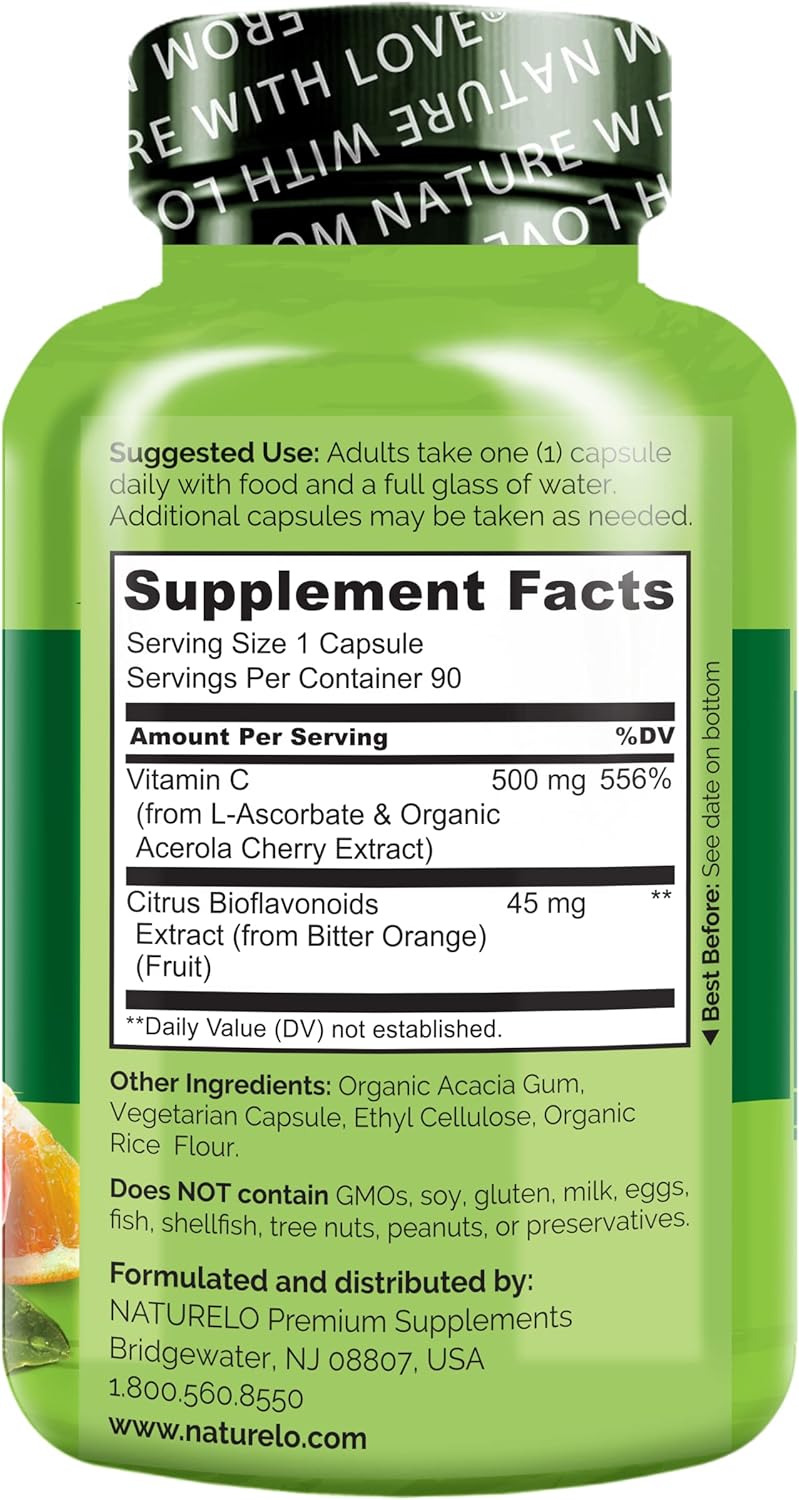 NATURELO Vitamina C con extracto de cereza de acerola orgánica y bioflavonoides cítricos, suplemento vegano, apoyo inmunológico, 500 mg VIT C por tapa, sin OMG, cápsulas