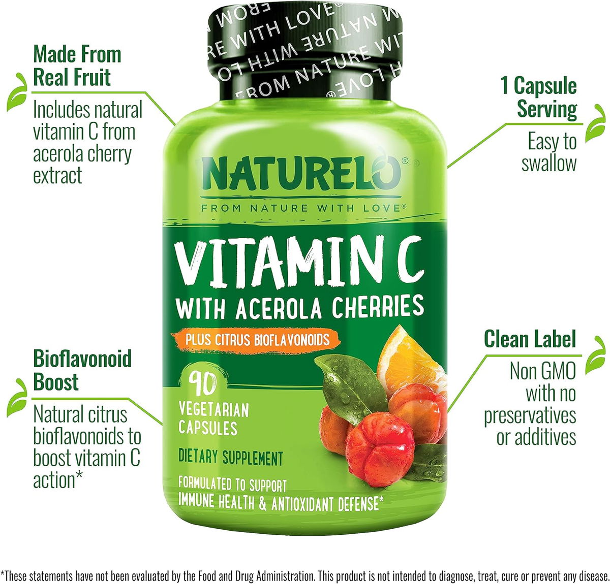 Con vitamina C a base de plantas: la vitamina C de origen natural del extracto de fruta de cereza de Acerola real ofrece vitamina C en una forma amigable a base de plantas que es fácil de absorber para tu cuerpo.