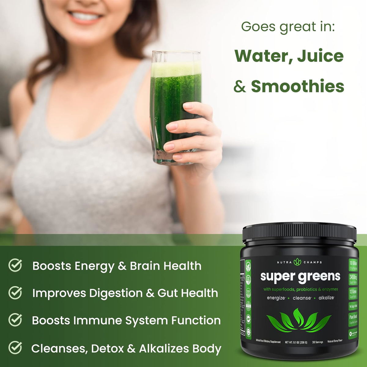 Super Greens Superalimento en polvo – Hierba de trigo, espirulina, clorela y más - Mezclas de antioxidantes, enzimas digestivas y probióticos | Suplemento vegano para jugos.