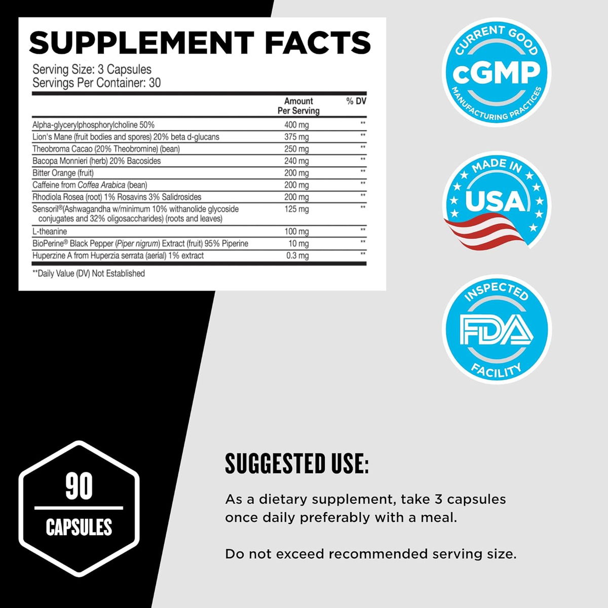 Alfa-glicerilfosforilcolina 50 %, melena de león (cuerpos fructíferos y esporas) 20 % beta d-glucanos, Theobroma Cacao (20 % teobromina) (frijol), Bacopa Monnieri (hierba) 20 % bacósidos, naranja amarga (fruta), cafeína de café Arábica (frijol), Rhodiola Rosea (raíz) 1% Rosavins 3% Salidrosides, Sensoril, L-teanina, BioPerine, Huperzine A