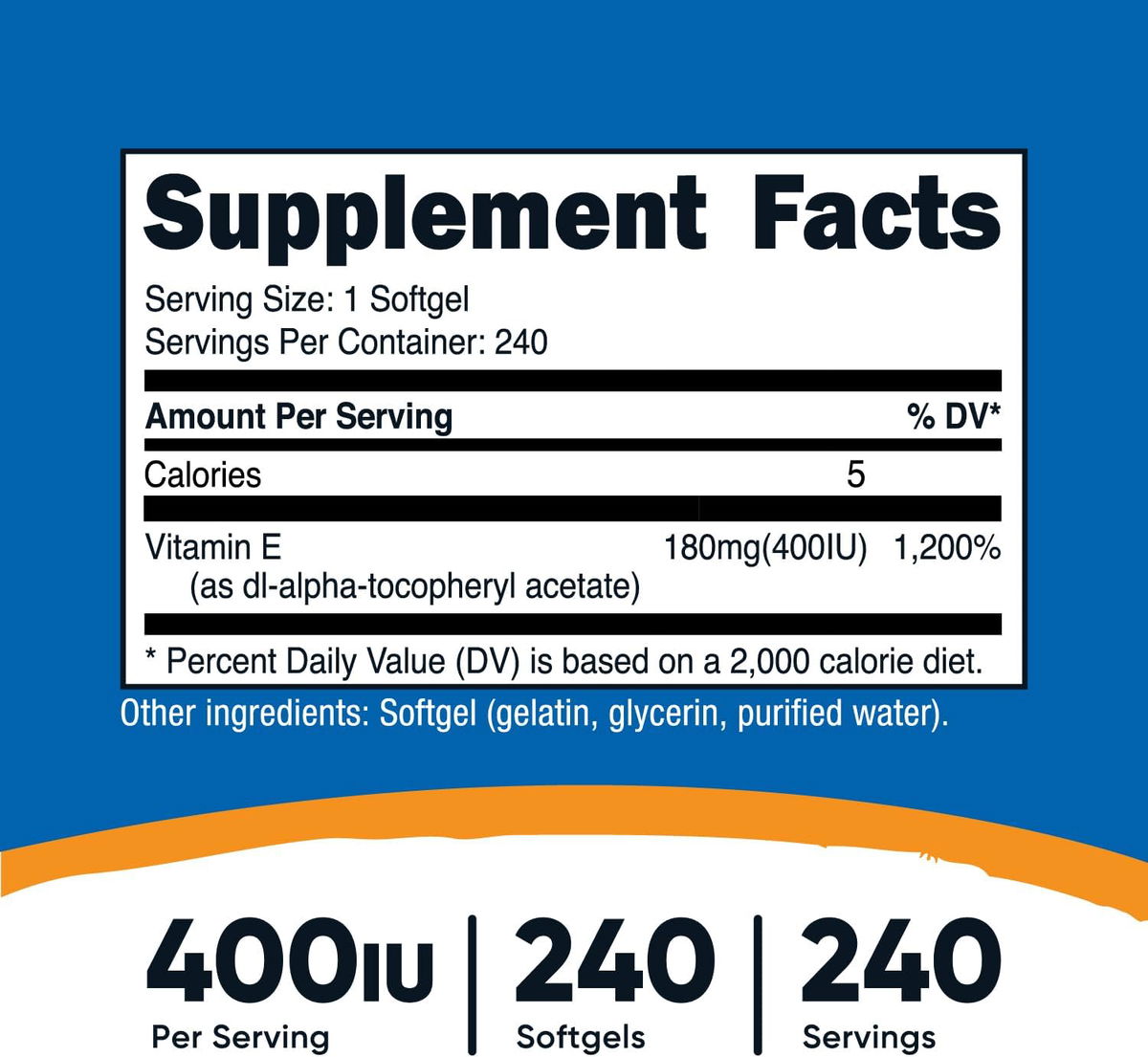 Nutricost Vitamina E. 400 UI de vitamina E potente .La vitamina E es un antioxidante y es un nutriente esencial para muchas células, incluidas las células musculares del corazón.