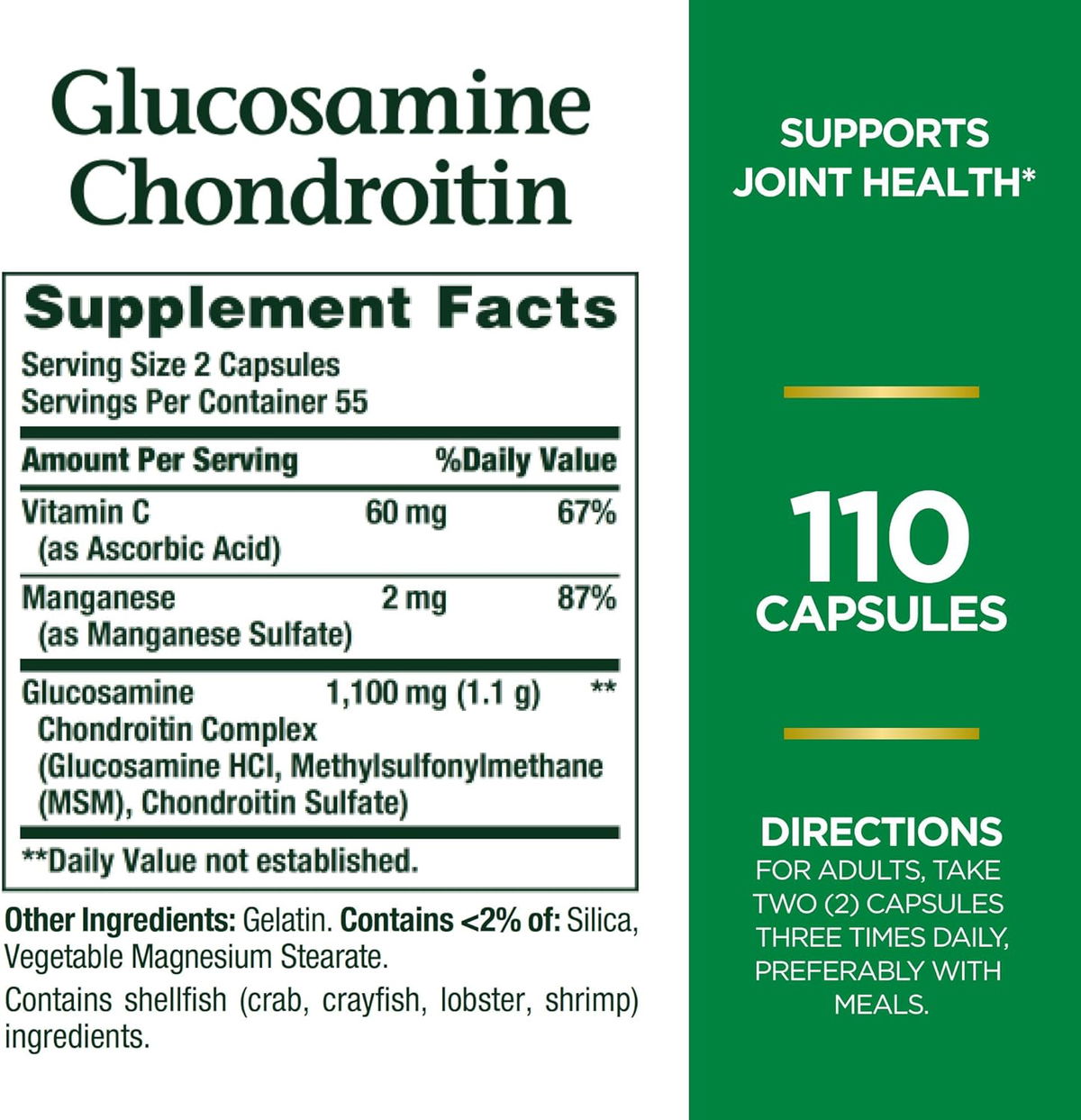 Vitamina C, Magnesio, Glucosamina, Otros ingredientes: gelatina, sílice, estearato de magnesio vegetal. Contiene ingredientes de mariscos (cangrejo, cangrejo, langosta, camarones).