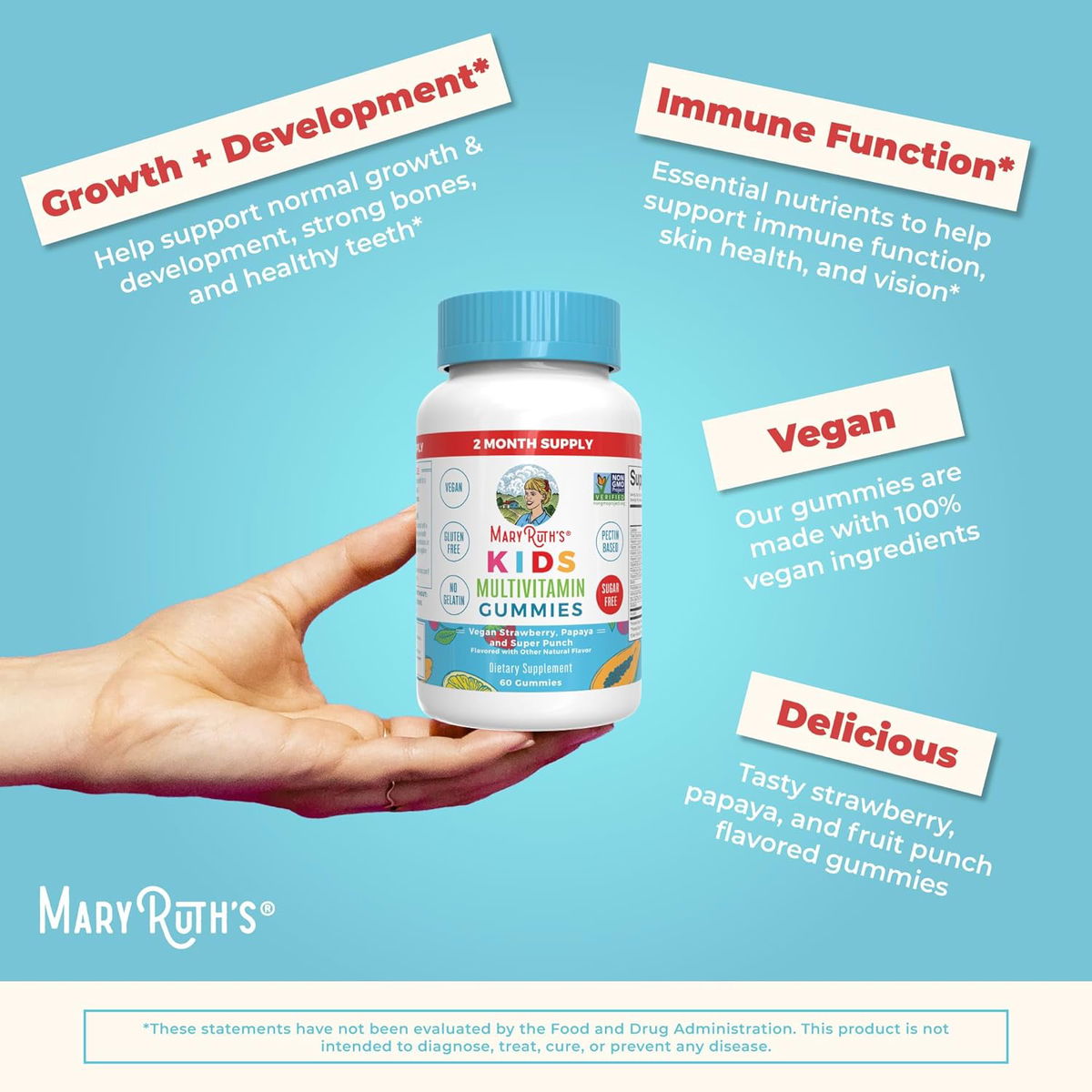Gomitas fáciles de masticar: no más pastillas o cápsulas difíciles de tragar. Nuestras gomitas vienen en deliciosos sabores de fresa, papaya y súper ponche disfrutados incluso por los comedores más exigentes. A partir de 2 años puede tomar 1 gomita al día, según lo recomendado por un médico o profesional de la salud.