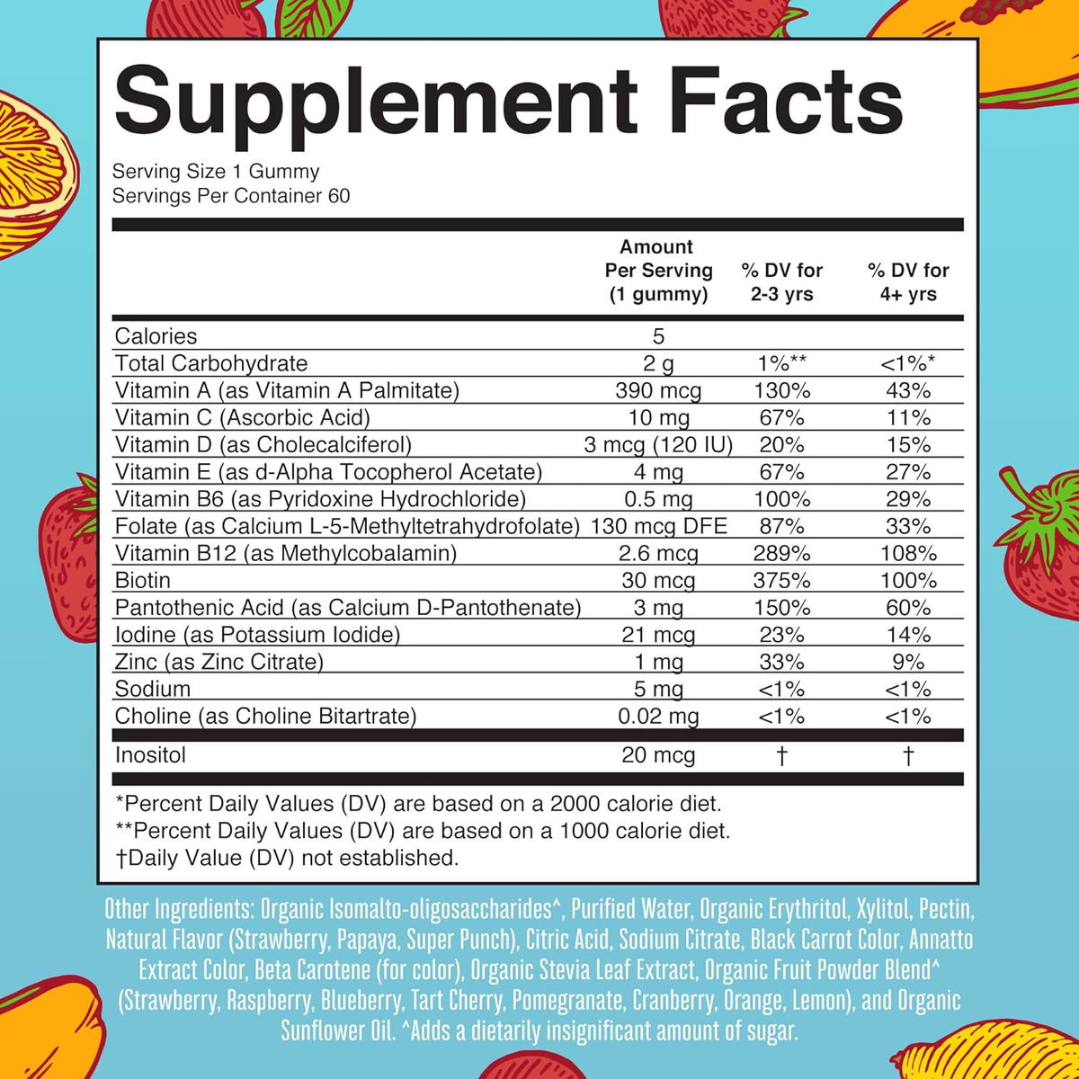 Vitamina A, Vitamina C, Vitamina D, Vitamina E, Vitamina B6, Vitamina B12, Yodo, Zinc, Isomalto-oligosacáridos orgánicos, agua purificada, eritritol orgánico, xilitol, pectina, sabor natural (fresa, papaya, súper ponch), ácido cítrico, citrato de sodio, color natural (zanahoria negra, Annatto, betacaroteno), extracto de hoja de estevia orgánica, mezcla de polvo de frutas orgánicas (fresa, frambuesa, arándano, cereza, tarta. erry, granada ate, arándano, naranja, limón), aceite de girasol orgánico.