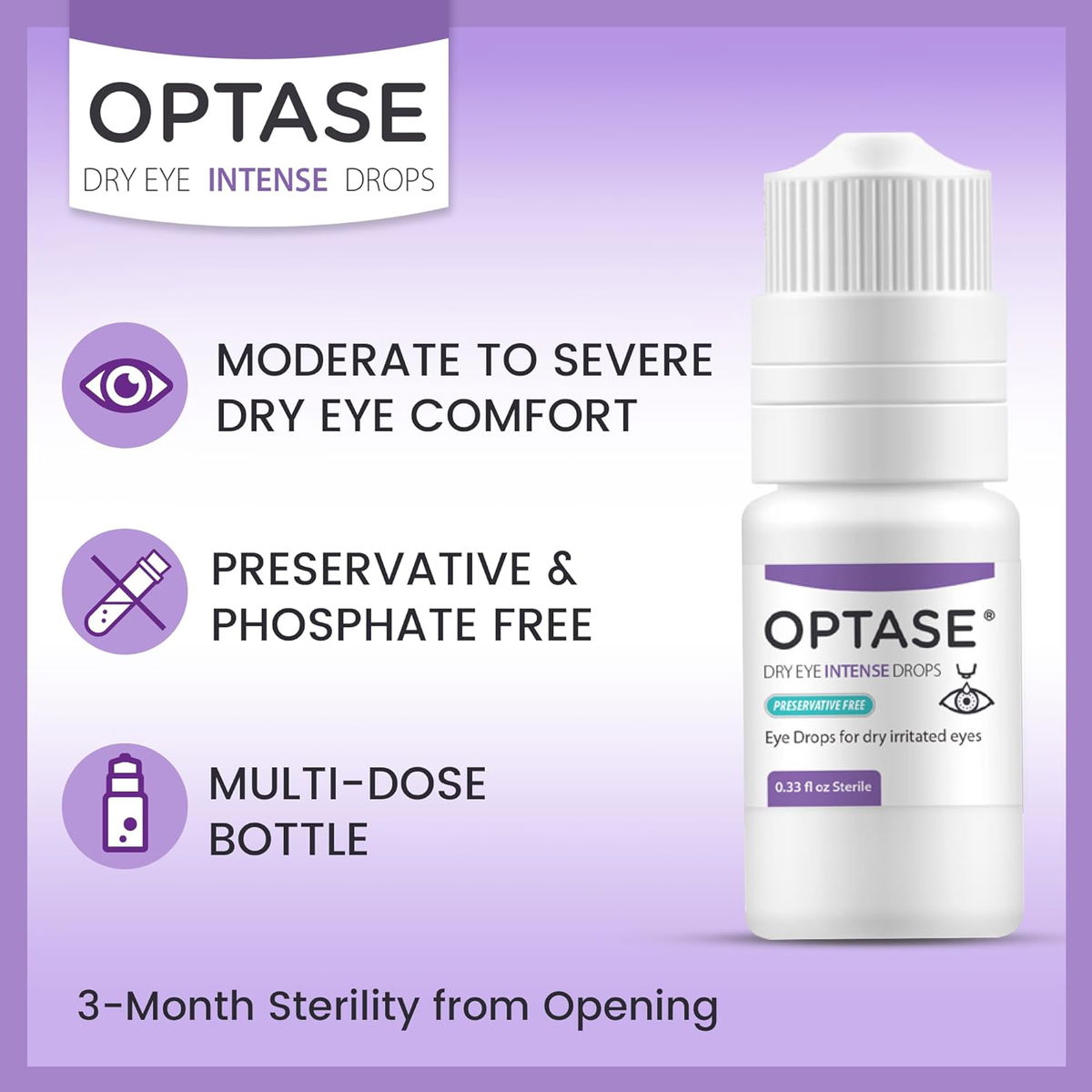 Alivio moderado a severo para los ojos secos: la formulación de larga duración de Optase Intense proporciona comodidad para el ojo seco y los pacientes postoperatorios. Y es seguro para lentes de contacto, proporcionando alivio cuando sea necesario