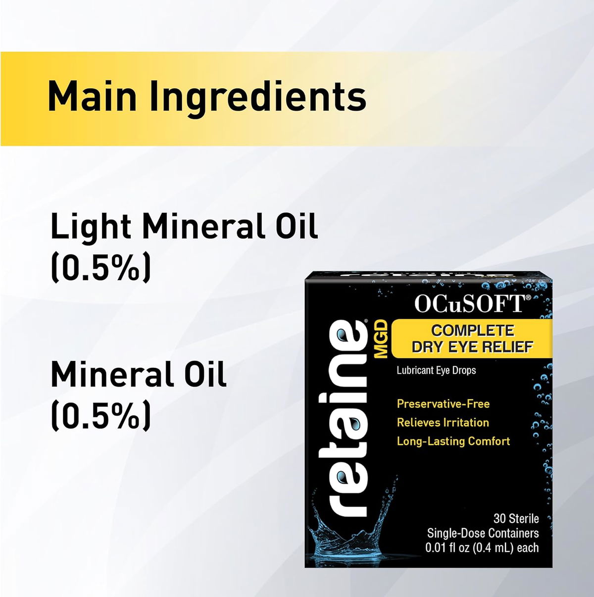 Emulsión Oftálmica, solución lechosa blanca, 30 unidades de uso único, 0.01 onzas líquidas cada uno, Mantiene Mgd es una revolucionaria conservantes emulsión ocular que hidrata, lubrica y protege moderada a severa seco ojos,