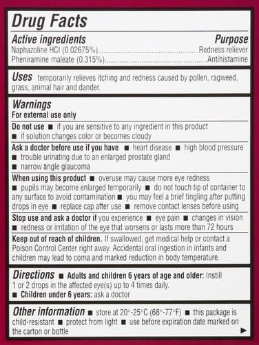 Ingredientes activos: Nafazolina HCI (0,02675%)- Feniramina maleato (0,315%) Ingredientes inactivos: Cloruro de benzalconio, ácido bórico, edetato disódico, hipromelosa, agua purificada, borato de sodio, cloruro de sodio. Se puede usar ácido clorhídrico para ajustar el pH.