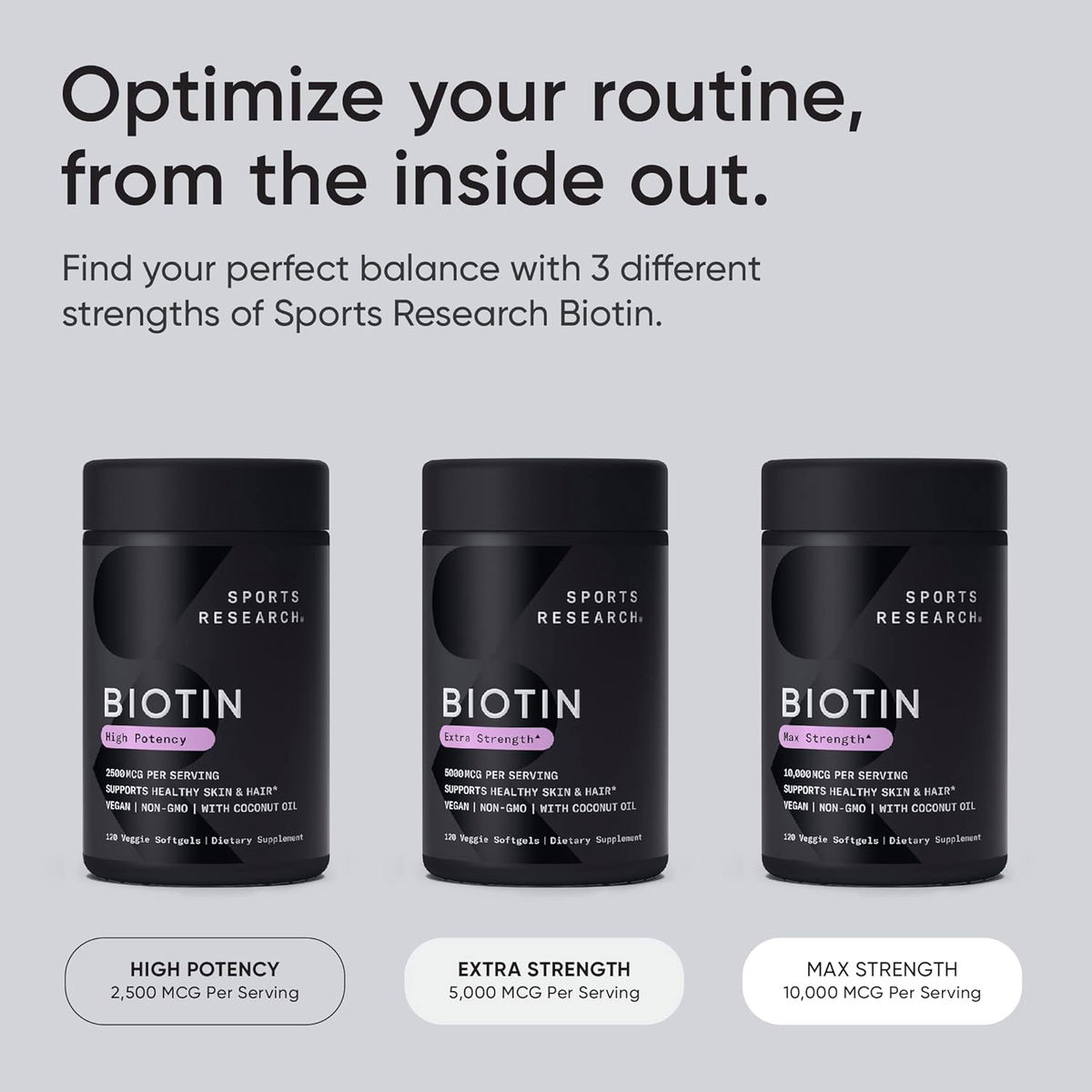 Nuestras vitaminas Biotin apoyan su cabello y piel y cuentan con 10,000 mcg de esta pieza esencial del complejo de vitamina B con aceite de coco virgen orgánico prensado en frío.
