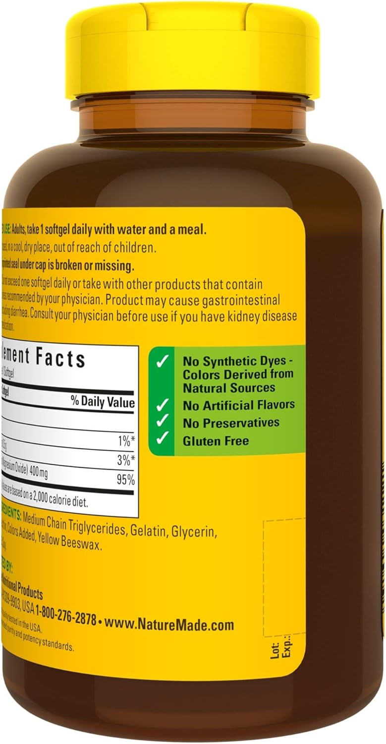 Estas cápsulas blandas de magnesio Nature Made de 400 mg sin gluten no tienen tintes sintéticos, sin sabores artificiales y sin conservantes