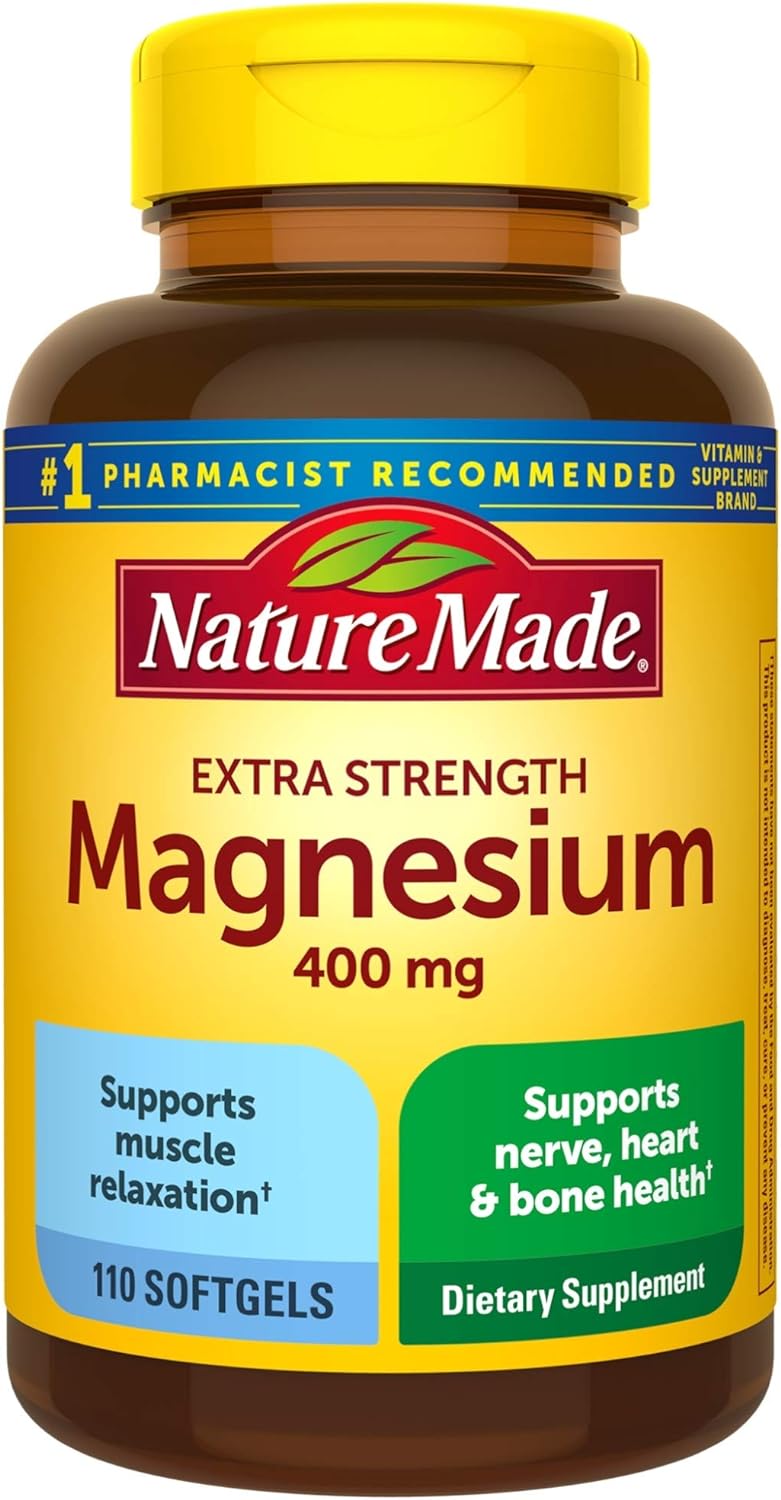 Suplemento de apoyo muscular: contiene una botella con cápsulas blandas de magnesio extra fuerte Nature Made de 400 mg.