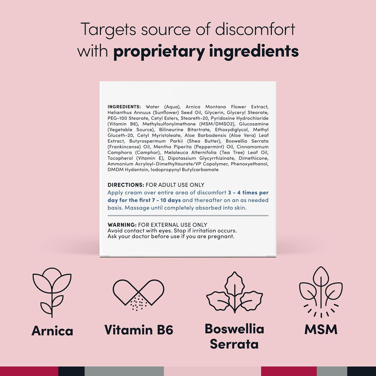 Agua (Aqua), extracto de flor de árnica montana, aceite de semilla de Helianthus Annuus (girasol), glicerina, estearato de glicerilo, estearato de PEG-100, ésteres cetílicos, esteareth-20, clorhidrato de piridoxina (vitamina B6), metilsulfonilmetano (MSM/DMSO2), glucosamina (fuente vegetal), bitartrato de bilineurina, etoxidiglicol, metilgluceth-20, miristoleato de cetilo, extracto de hoja de aloe barbadensis (áloe vera), butyrospermum parkii (manteca de karité), aceite de boswellia serrata (incienso), aceite de menta piperita (menta), canela alcanfor (alcanfor), aceite de hoja de melaleuca alternifolia (árbol de té), tocoferol (vitamina E), glicirricinato dipotásico, dimeticona, copolímero de acriloil-dimetiltaurato/VP de amonio, fenoxietanol, DMDM hidantoína, butilcarbamato de yodopropinilo