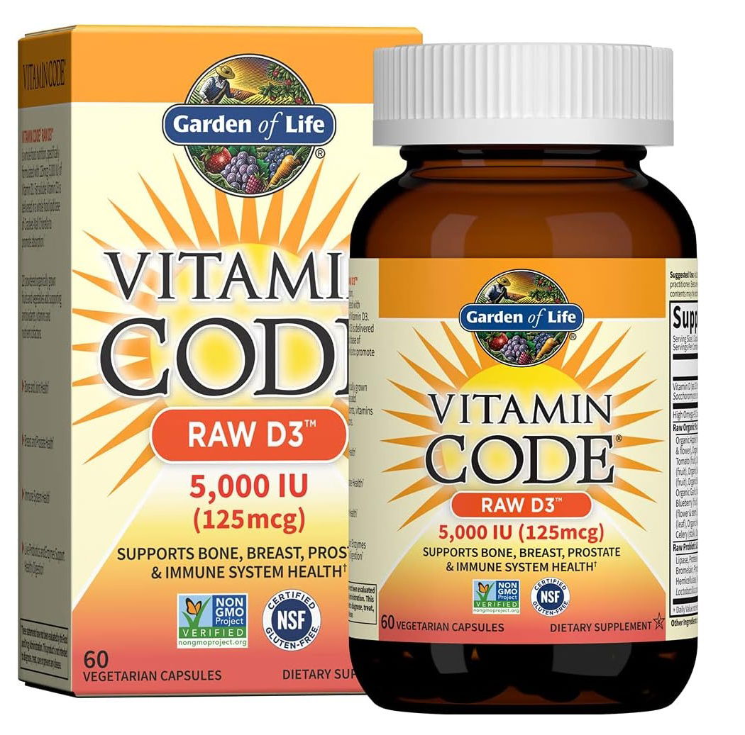 Garden of Life Vitamina D, código de vitamina D3 crudo, vitamina D 5,000 IU, suplementos de vitamina D de alimentos integrales crudos con clorella, frutas, verduras y probióticos para la salud ósea e inmunológica. Cápsulas vegetarianas