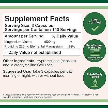 Magnesio unido al ácido málico: nuestro malato de magnesio consta de 225 mg de magnesio unido a 1,275 mg de ácido málico (proporciona más del 50% de la ingesta diaria de magnesio)