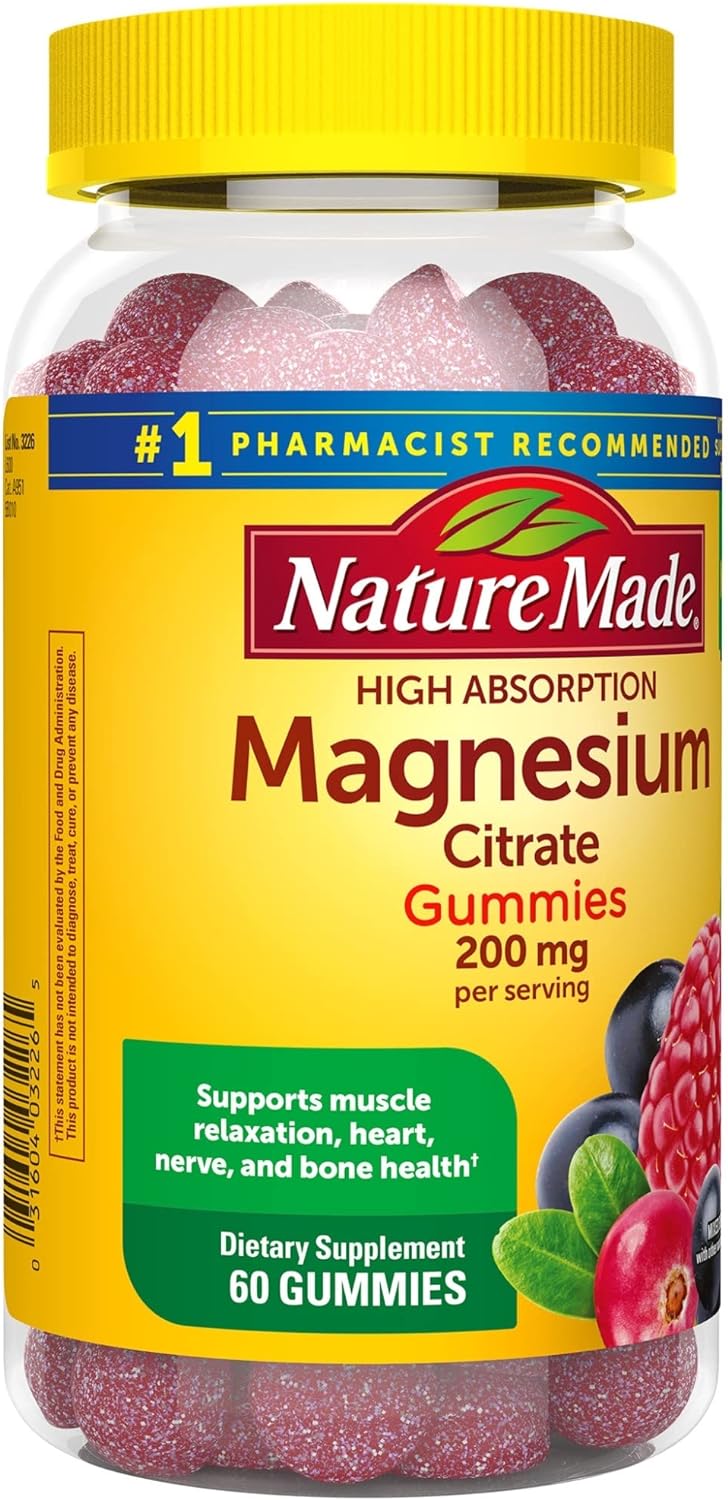 Suplemento de apoyo nervioso, hueso y corazón. Citrato de magnesio de alta absorción Nature Made de 200 mg por porción de gomitas