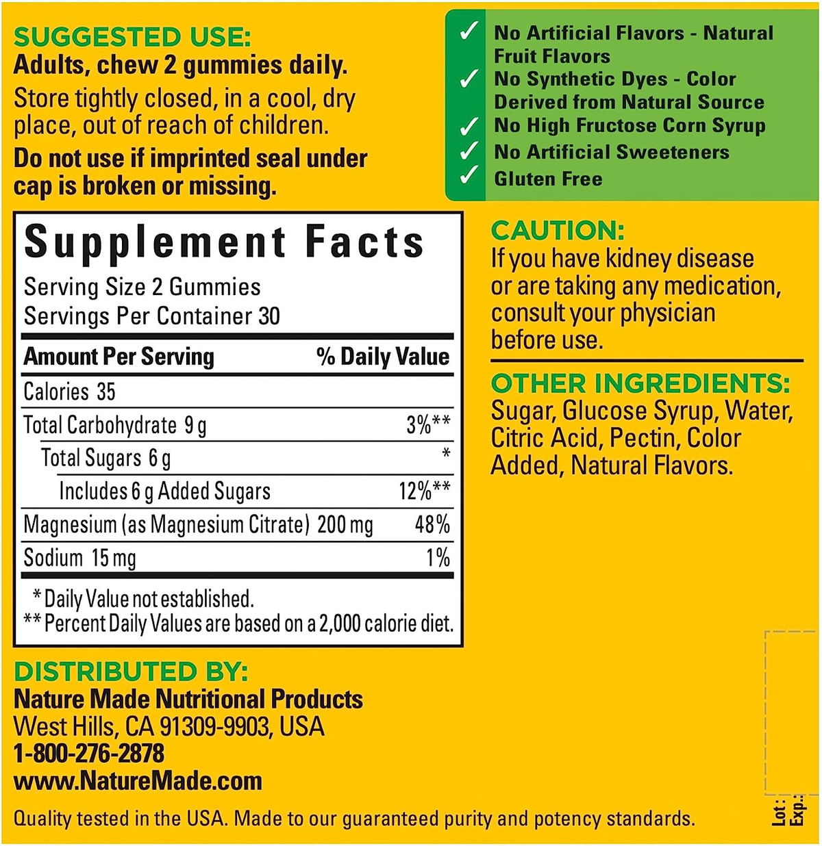 Cada gomita de citrato de magnesio Nature Made está hecha con pectina, no gelatina, sin gluten, sin sabores artificiales, sin tintes sintéticos, sin jarabe de maíz de alta fructosa y sin edulcorantes artificiales