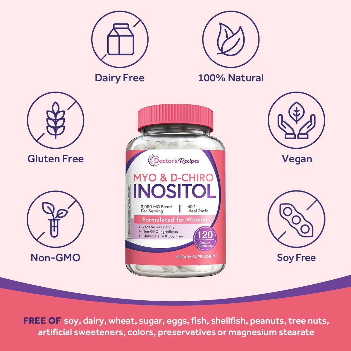 Doctor's Recipes Inositol Supplement for Women, Myo-Inositol & D-Chiro Inositol Capsules 2050mg per Serving, Ideal 40:1 Blend, 120 Vegan Caps