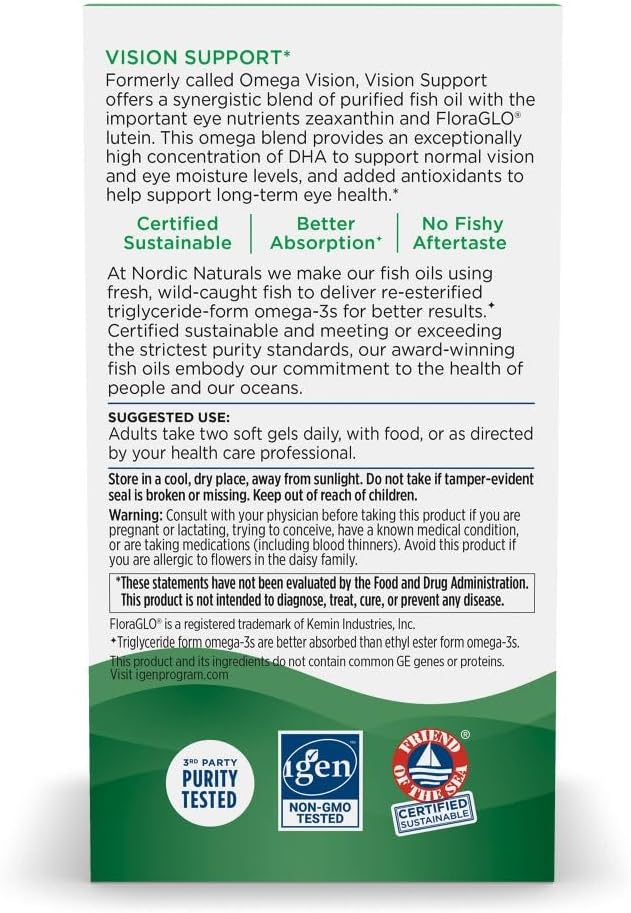 Salud ocular a largo plazo: Omega Vision está específicamente formulado con omega-3 concentrados, luteína y zeaxantina para apoyar la salud ocular y una visión saludable, mientras que también protege contra la dañina luz azul ultravioleta.