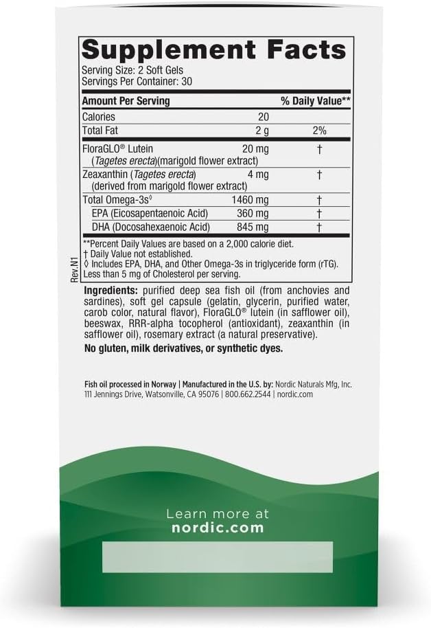 Aceite de pescado purificado de aguas profundas (de anchoas y sardinas). cápsula de gel suave (gelatina. Glicerina. Agua purificada. color algarrobo. Sabor natural). Luteína FloraGLO(R) (en aceite de cártamo). cera de abejas. RRR-alfa tocoferol (antioxidante). zeaxantina (en aceite de maíz). extracto de romero (un conservante natural). Sin gluten. derivados de la leche. o tintes sintéticos.