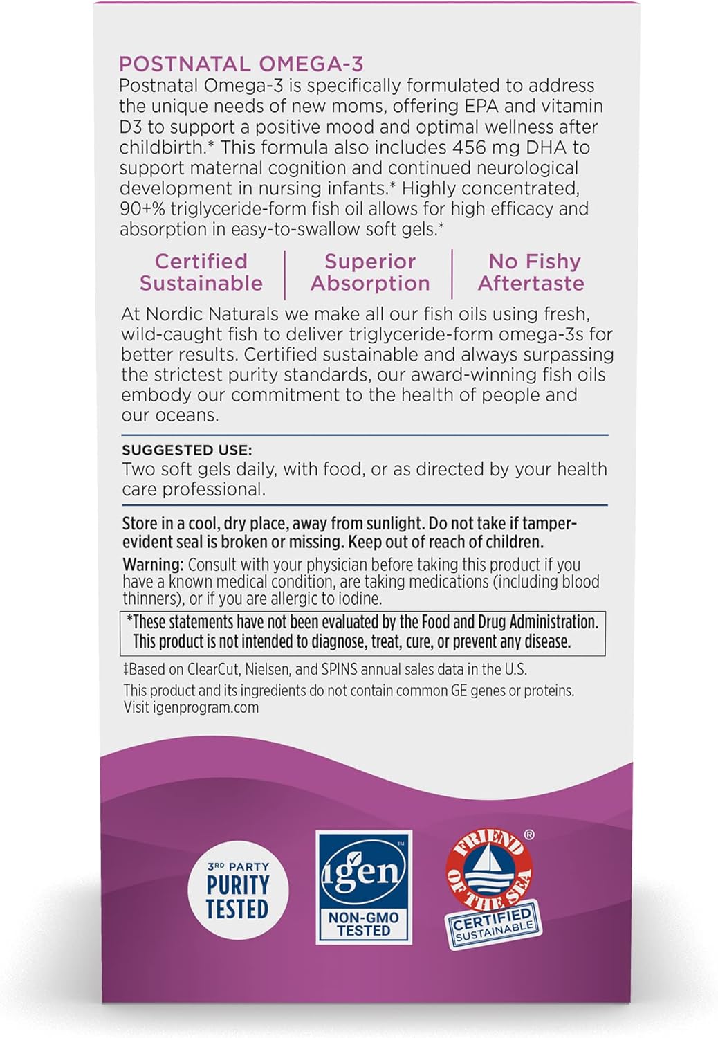 Nordic Naturals cápsulas de gel sabor limón de omega 3 para posparto, especial para madres recientes, para promover el óptimo bienestar después del parto.