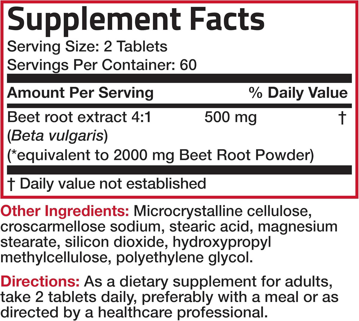 Fórmula extra fuerte: Bronson Beet Root proporciona equivalente a 2000 mg de polvo de raíz de remolacha por porción (de 500 mg de extracto 4:1) para ayudar al cuerpo a mantener una circulación saludable y resistencia general. * Las remolachas contienen naturalmente nitratos, que se ha demostrado que apoyan la función vascular.