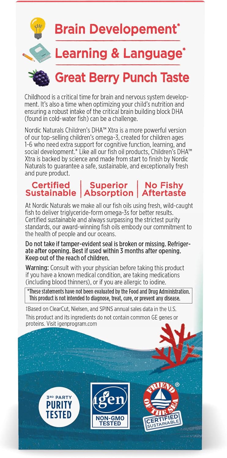 Nordic Naturals DHA Xtra para niños, Berry Punch - 2 onzas para niños, 880 mg de Omega-3 total con EPA y DHA - Función cognitiva e inmunológica, aprendizaje, desarrollo social, sin OMG - 48 porciones