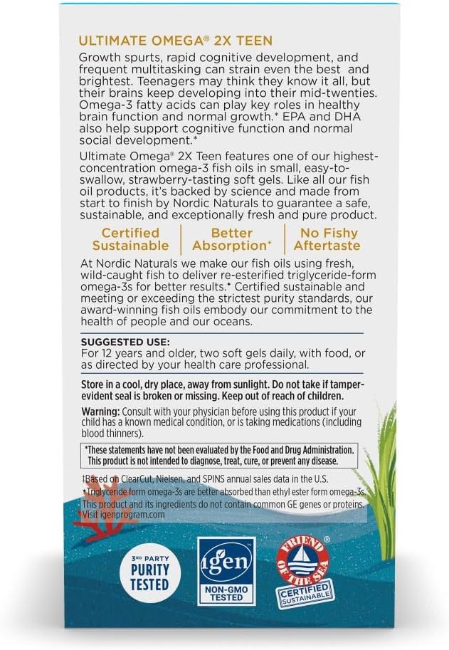 Mejor absorción, mejor sabor: todos los aceites de pescado Nordic Naturals están en forma de triglicéridos (la forma que se encuentra naturalmente en el pescado) para una absorción óptima. Ultimate Omega 2x Teen tiene un gran sabor a fresa.
