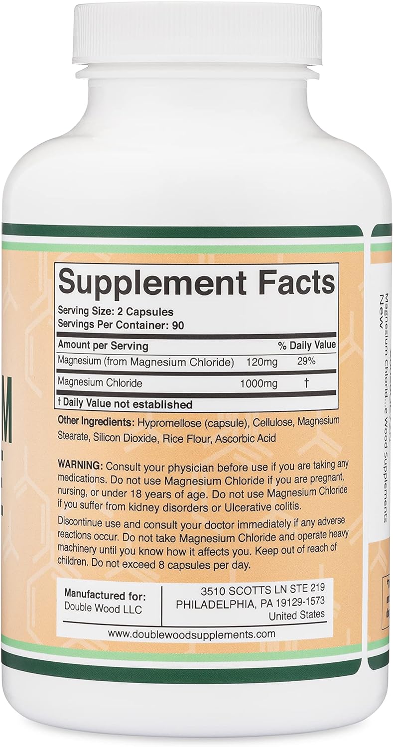 Cloruro de Magnesio (Cloruro De Magnesio). Cápsulas de 1,000 mg por porción, apoya la salud digestiva y ósea. Sin OMG y sin gluten por Double Wood Supplements