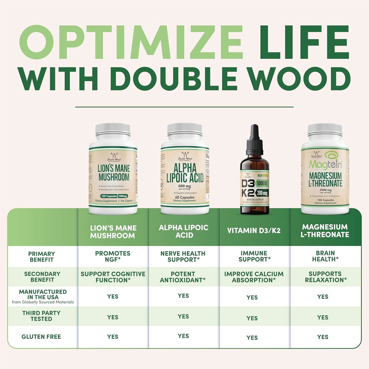 WE BOTTLE WELLNESS: En Double Wood proporcionamos suplementos puros y potentes que ofrecen un valor excepcional, todos respaldados por un cuidadoso abastecimiento y rigurosas pruebas de terceros.